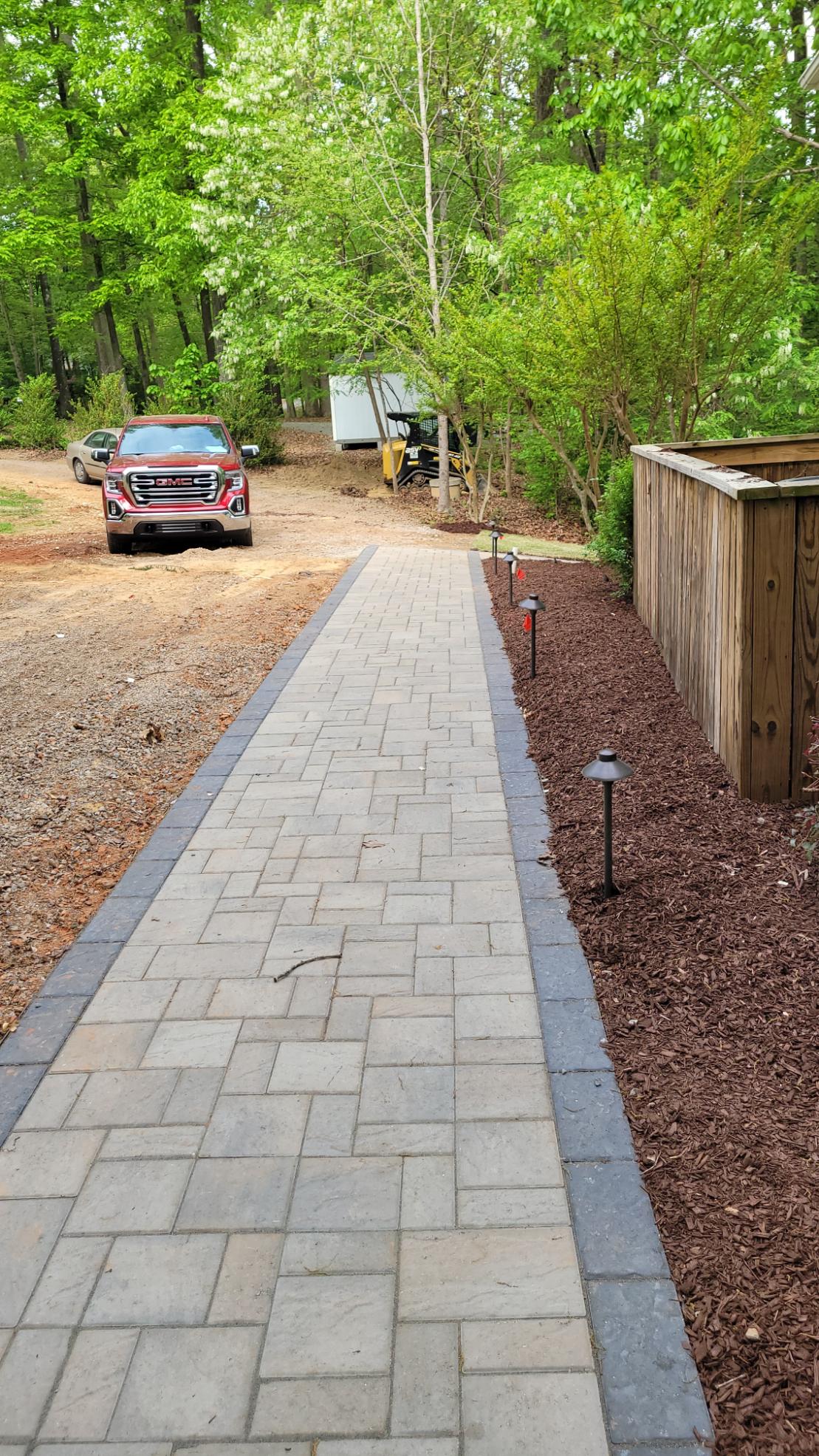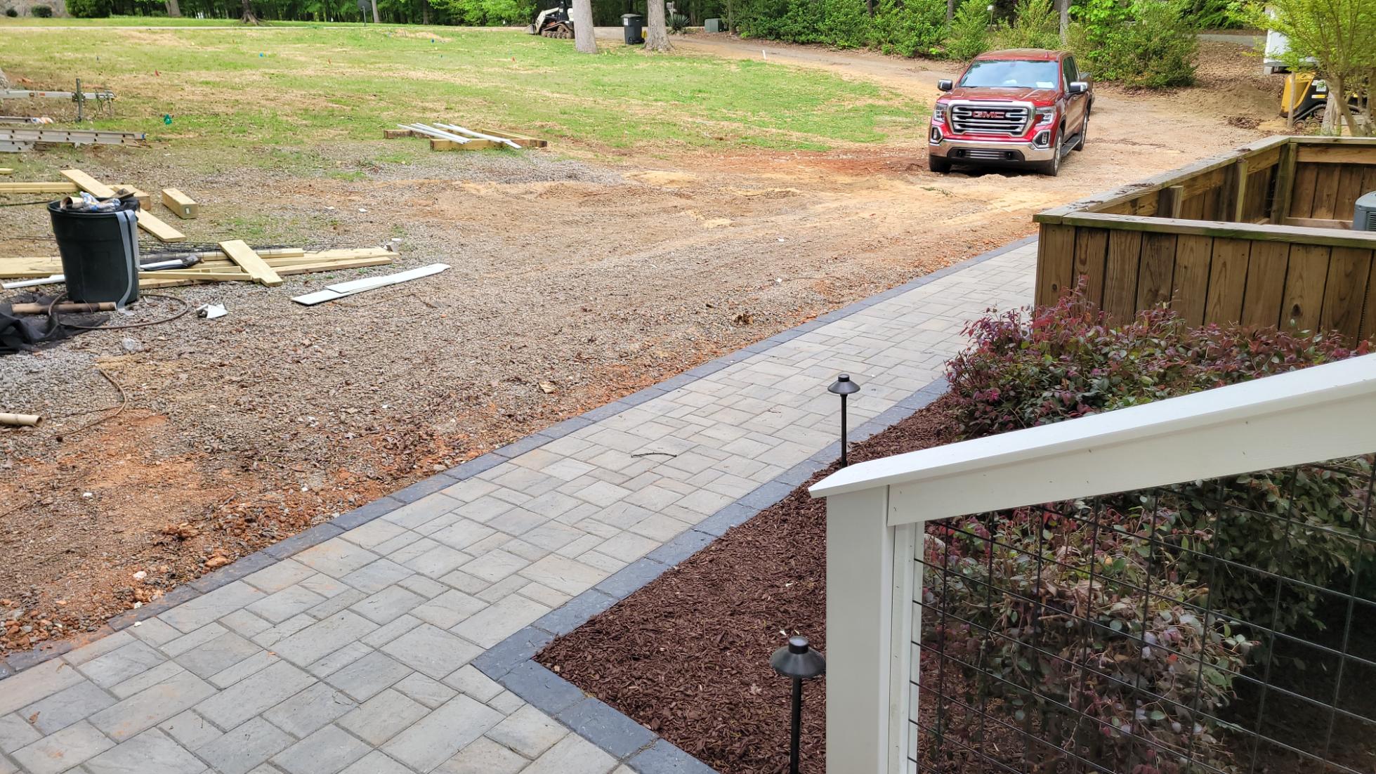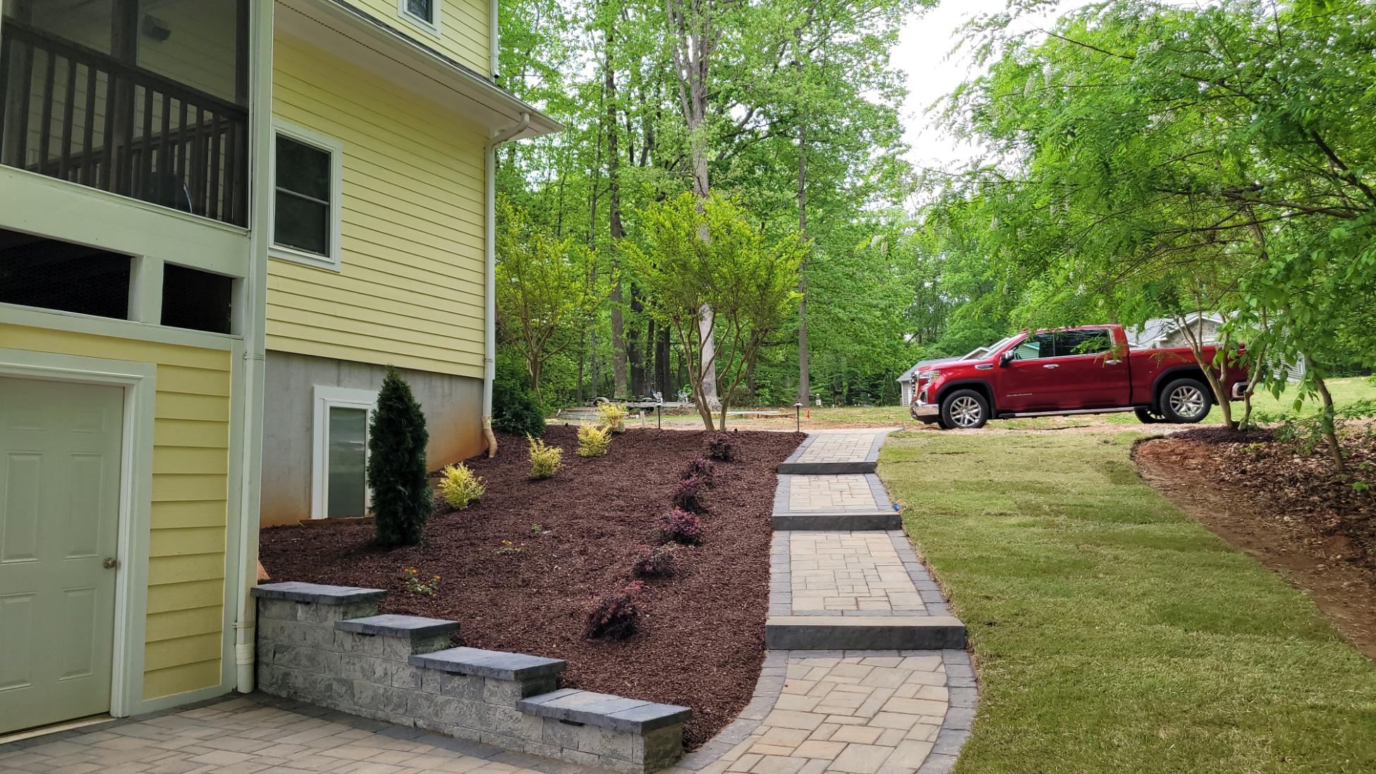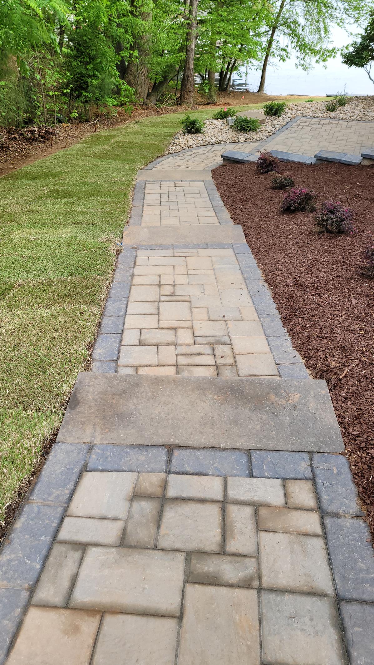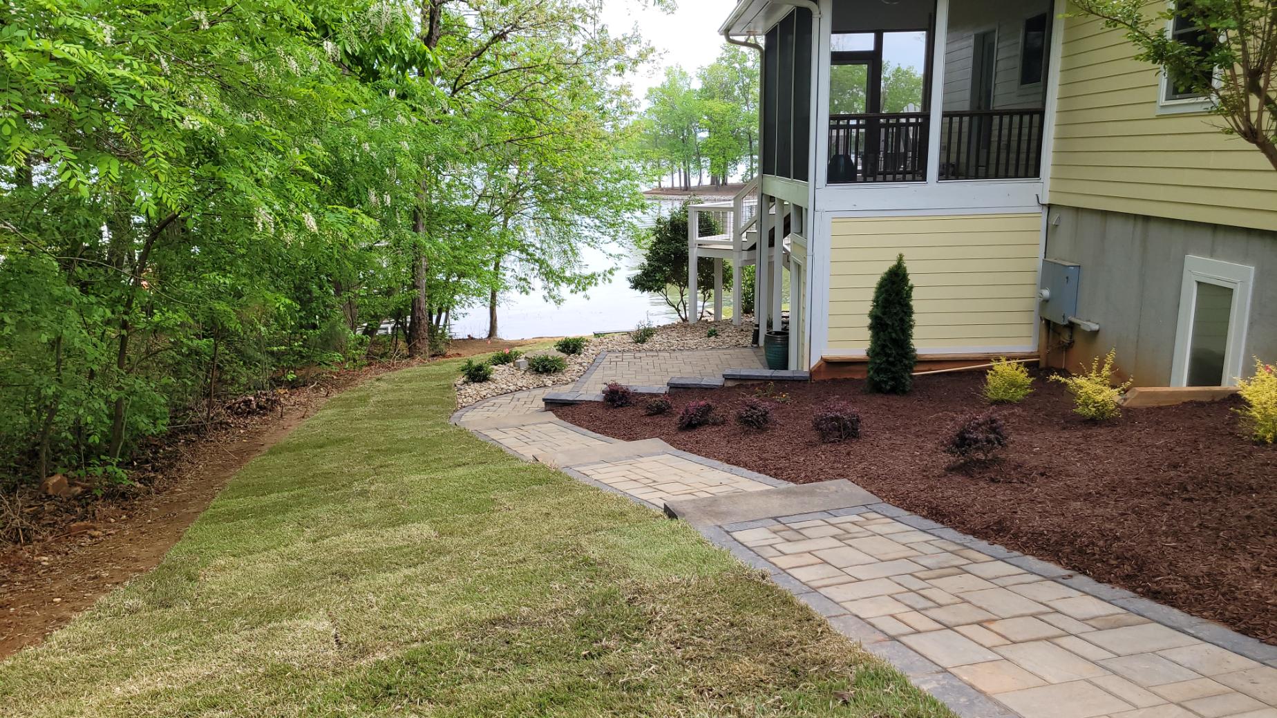This project is progressing nicely. Most of the lake side of the property has been finished, with new sod, a paver walkway, and a garden bed of plantings. The front and side paver walkways and planting beds were just installed with some grading, new sod, and a paver parking pad to come.