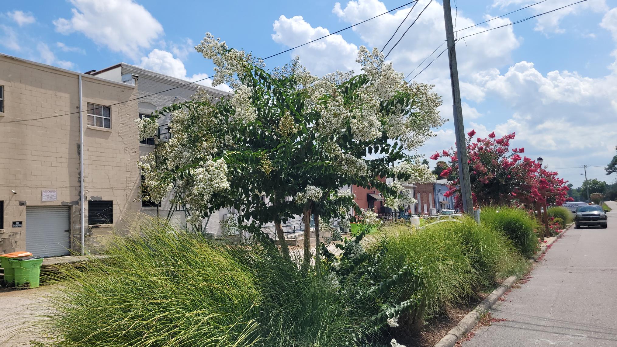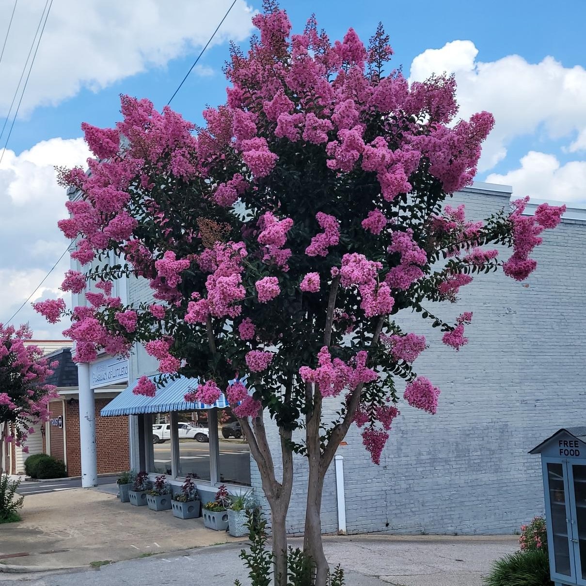 Crape myrtles! When the high heat of summer kicks in, crape myrtles flourish and pop out their distinctive colorful blooms. Case in point: the crape myrtles lining the streets of downtown Littleton.