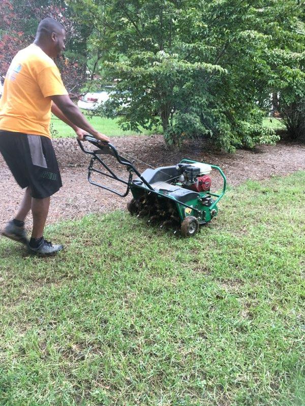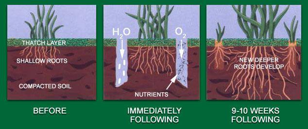 Aeration is simple enough: it involves mechanically poking thousands of holes in the soil. This allows oxygen, but also water and fertilizer, to circulate down there where the root system is working its magic. Additionally, our clay soils are prone to tight compaction over time, becoming near brick-like in consistency. Aeration loosens the clay, allowing air, water, and nutrients to penetrate farther into the ground. This in turn encourages the roots to extend themselves.