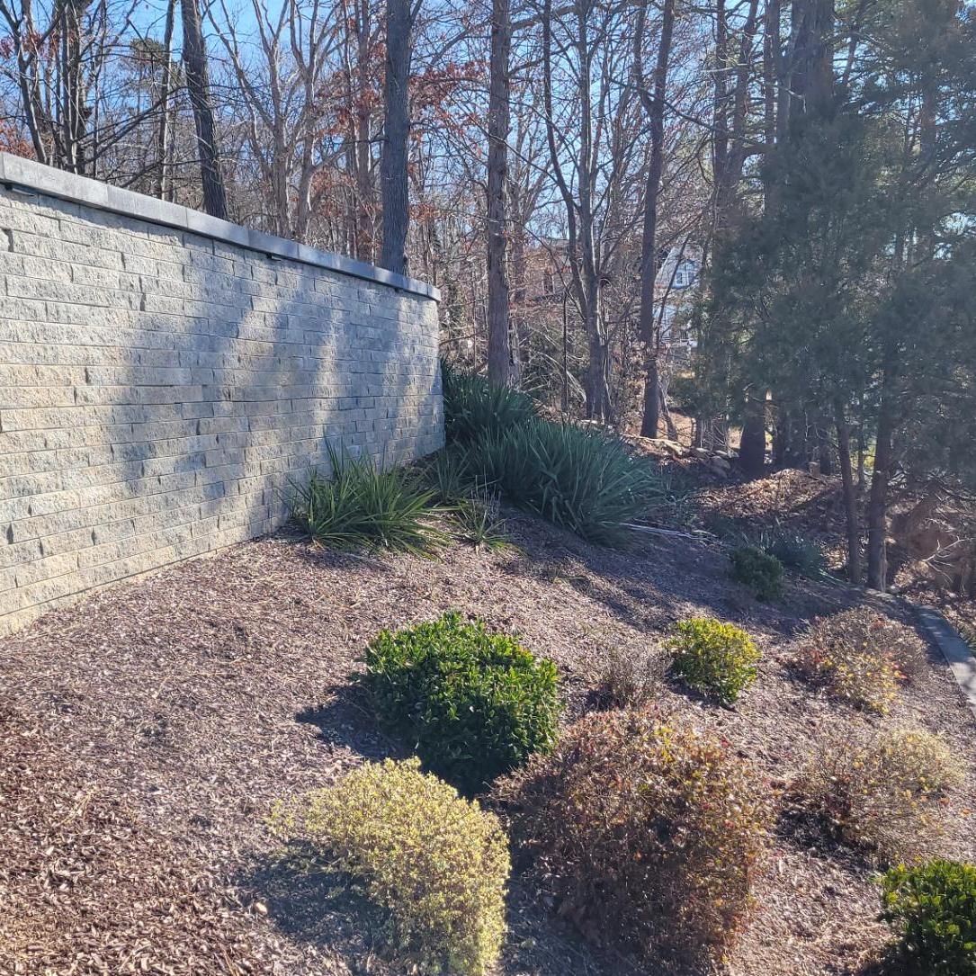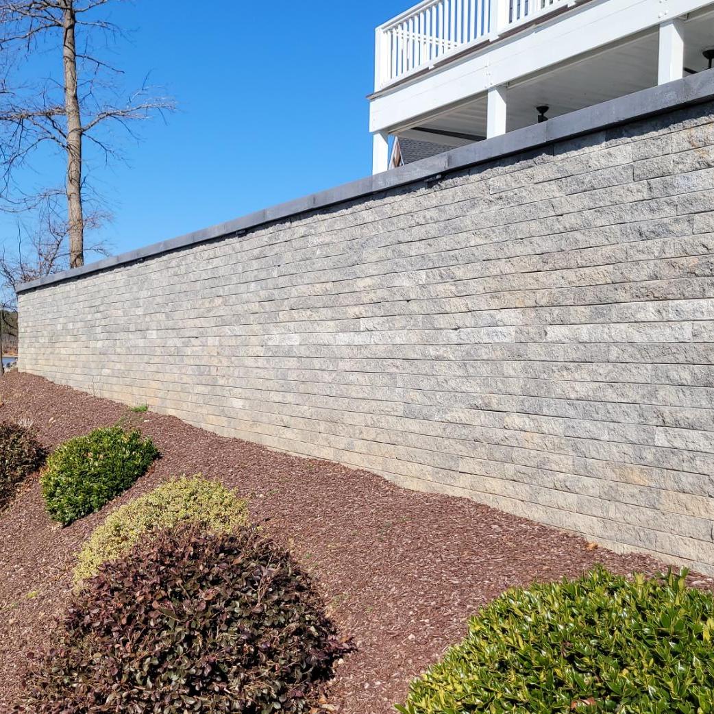 This patio is supported by a Shale Grey Mini Creta retaining wall running the length of the Lake front edge of the patio. The wall height varies from 18″ to 60″ depending on the slope …