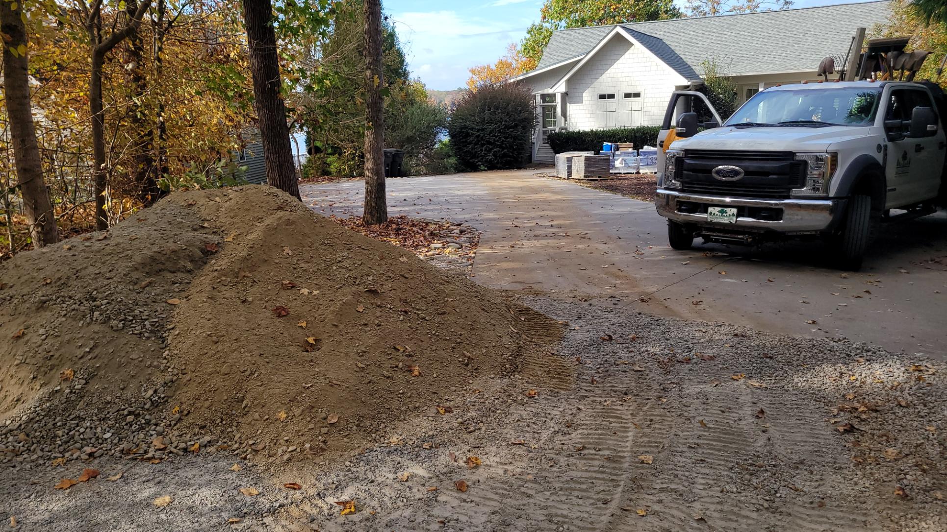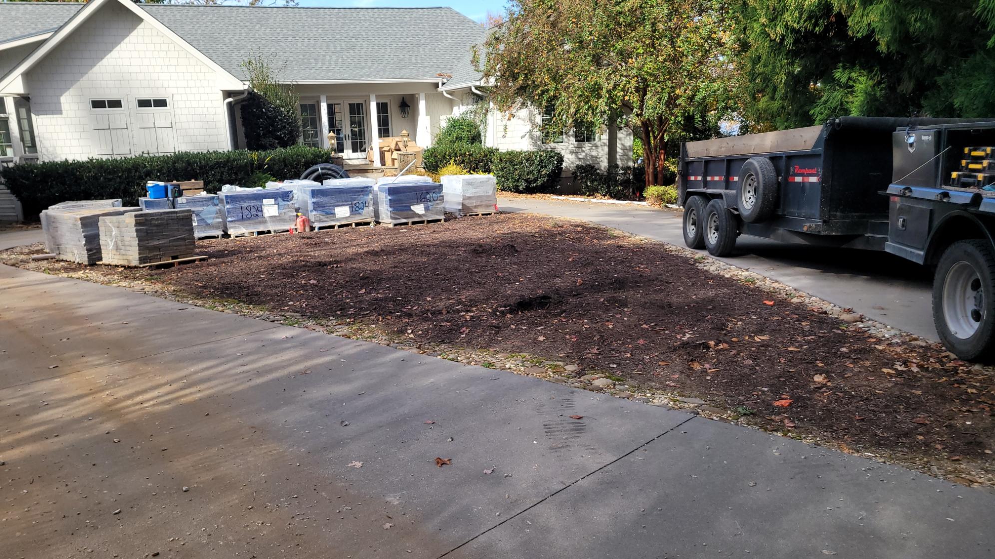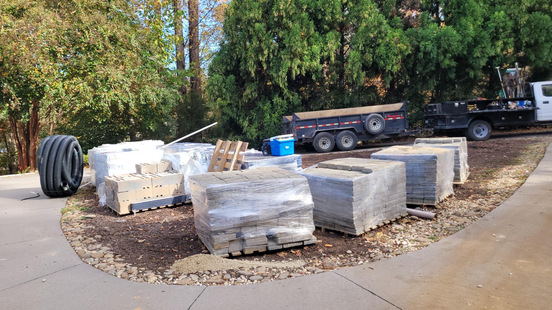 All materials for this work have been trucked in and are awaiting deployment. We will be widening this driveway with Champlain Grey Eva pavers and this center circle will be a new garden bed with Wintergreen Boxwoods and other plants.