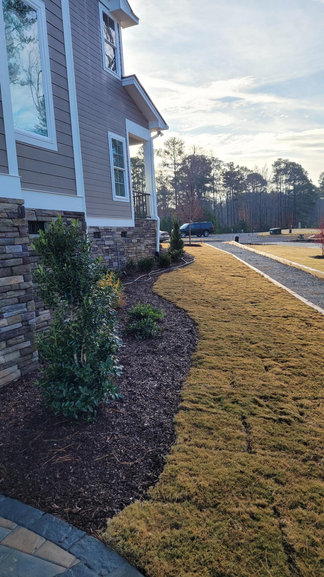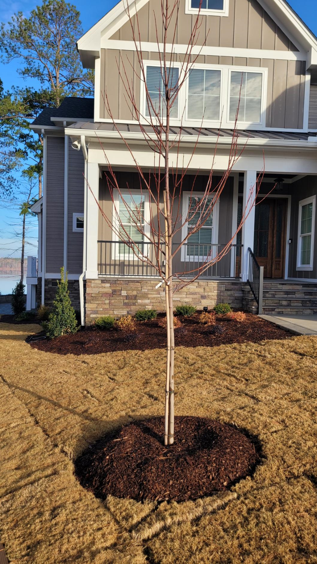 We did some fine grading, brought in fresh topsoil, and installed an October Glory Red Maple, Taylor’s Rudolph Dwarf Yaupons Vintage Jade Distyllium, Sunshine Ligustrum, among others. We finished it all off with contrastive Dark Walnut Shredded Mulch.