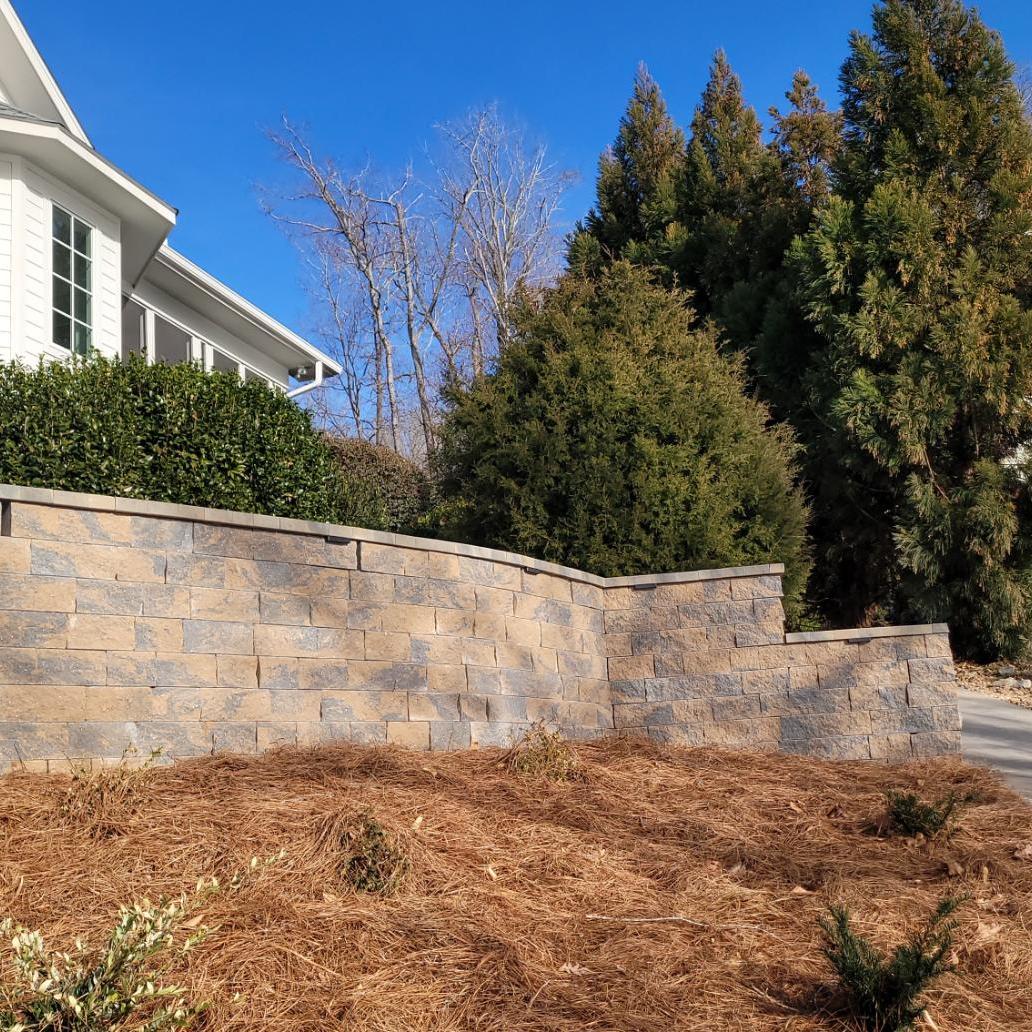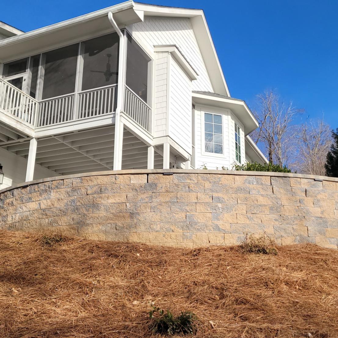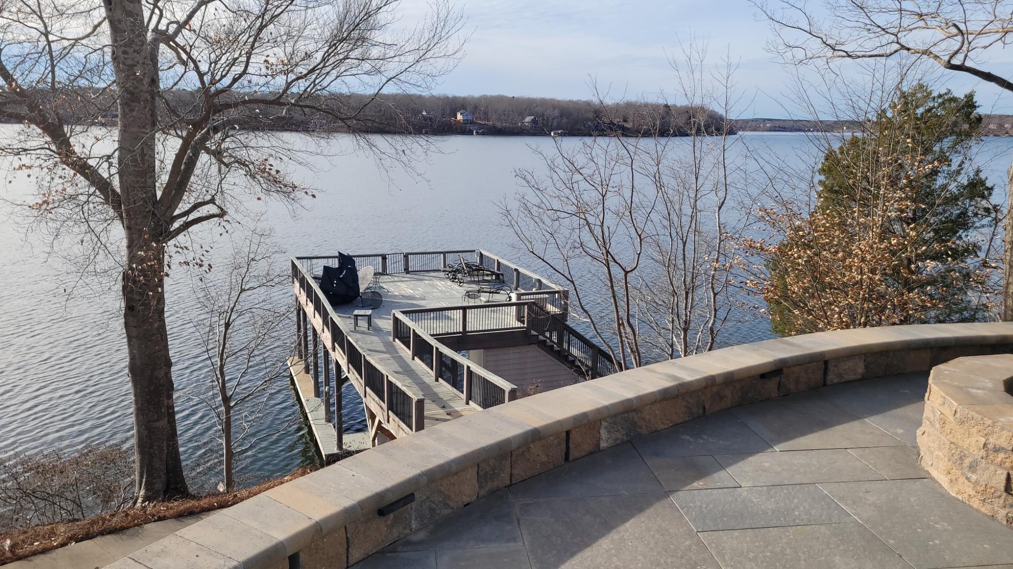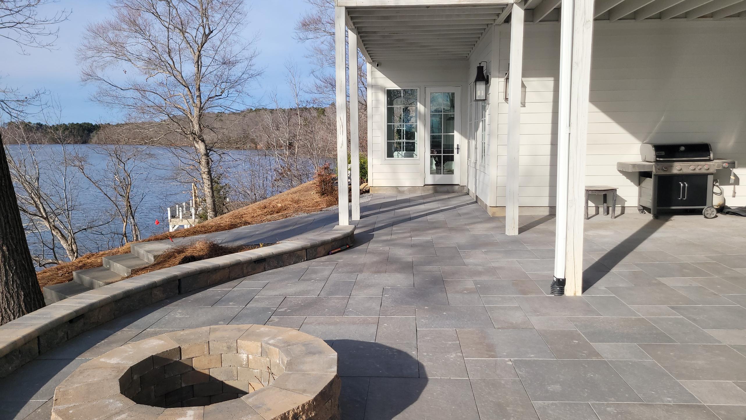 The patio is supported by a 50′ long Sandalwood Mini Creta retaining wall. We also cleared this steep slope down to the Lake and mulched in new plant material.