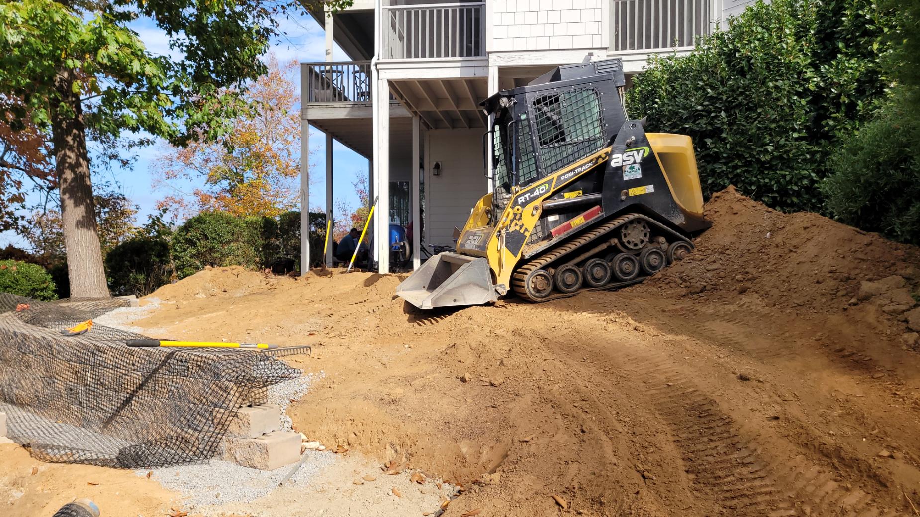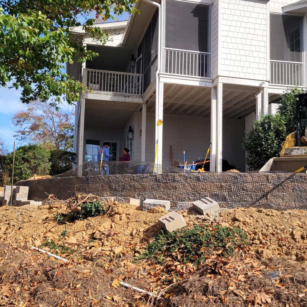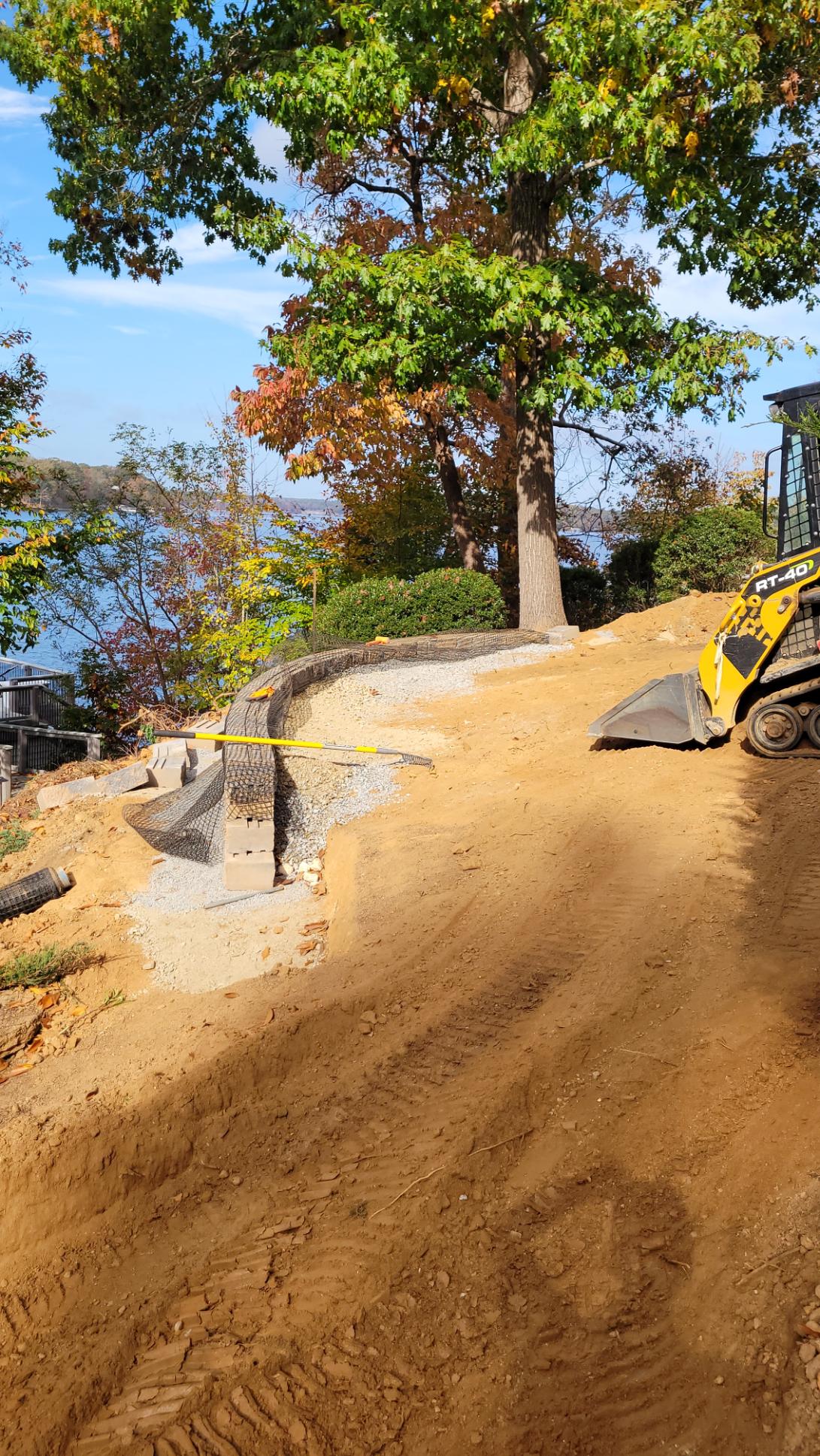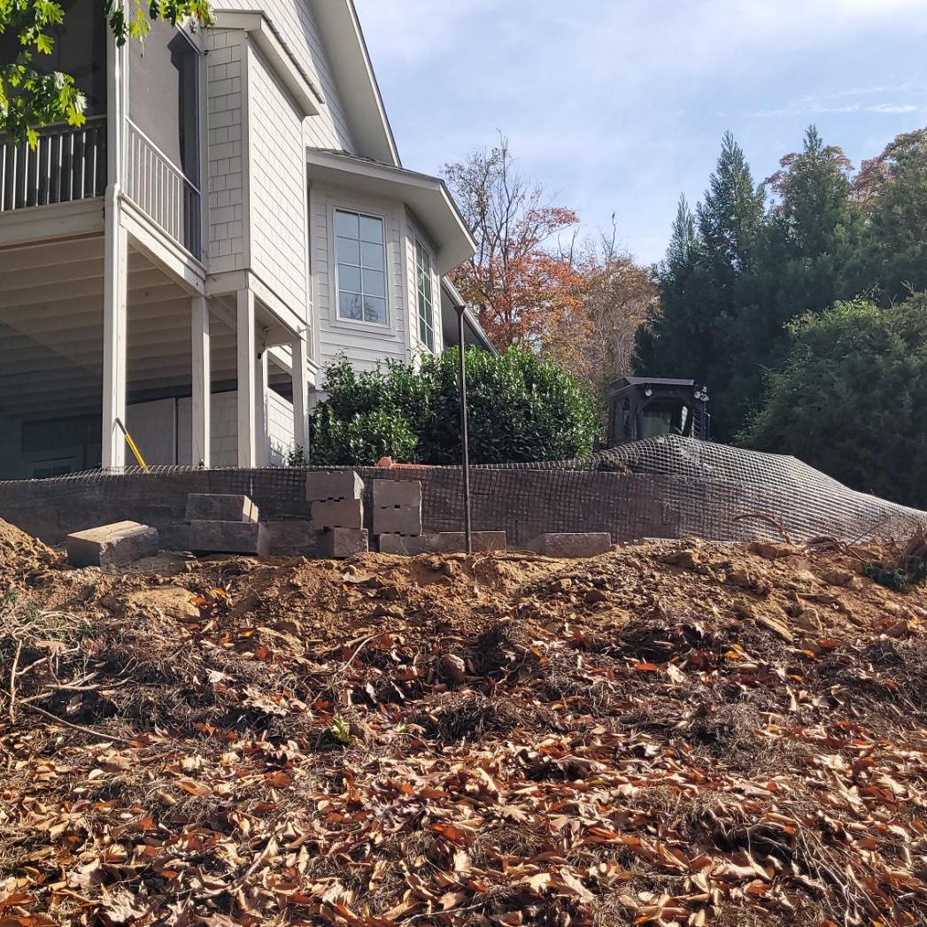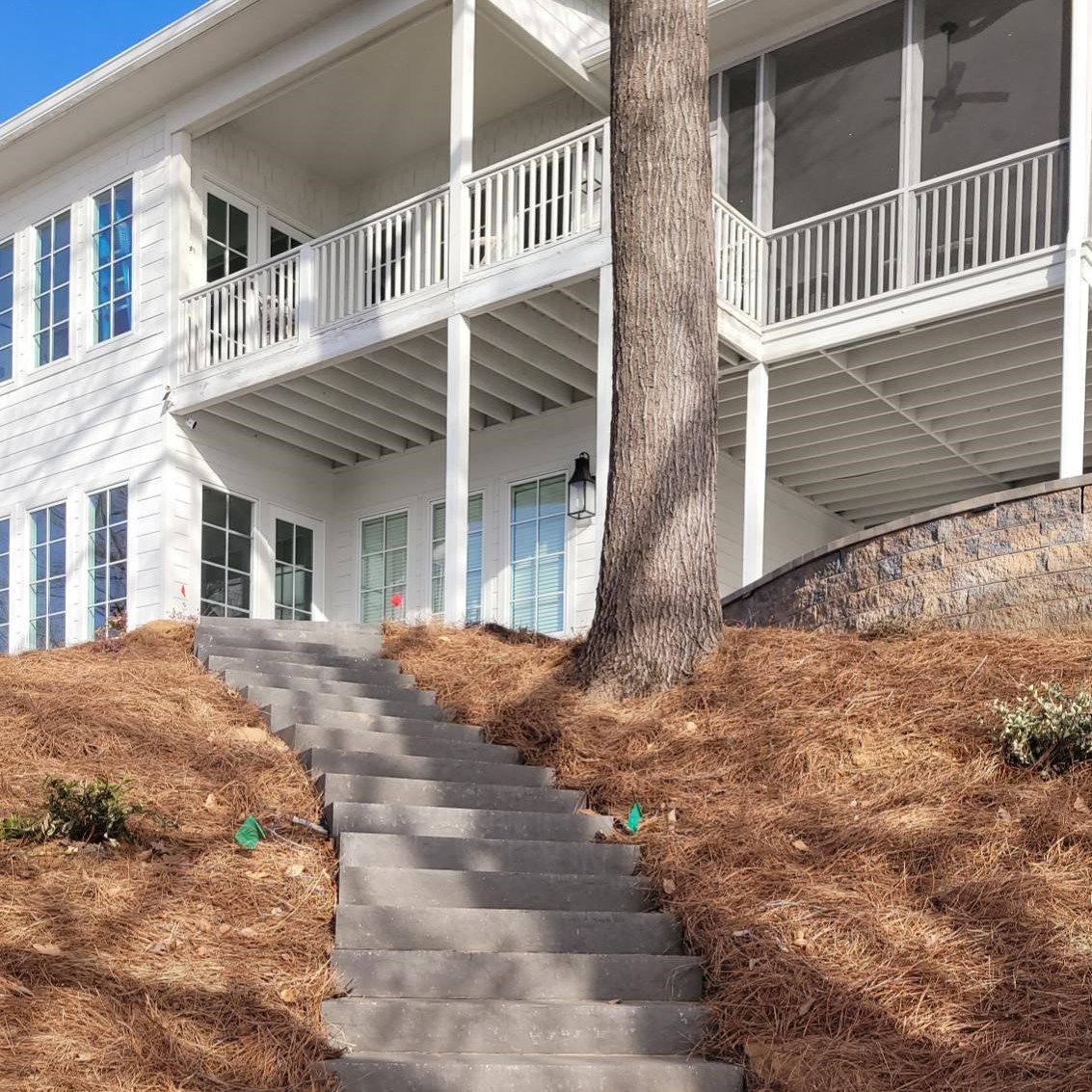 The patio is supported by a 50′ long Sandalwood Mini Creta retaining wall. We also cleared this steep slope down to the Lake and mulched in new plant material.