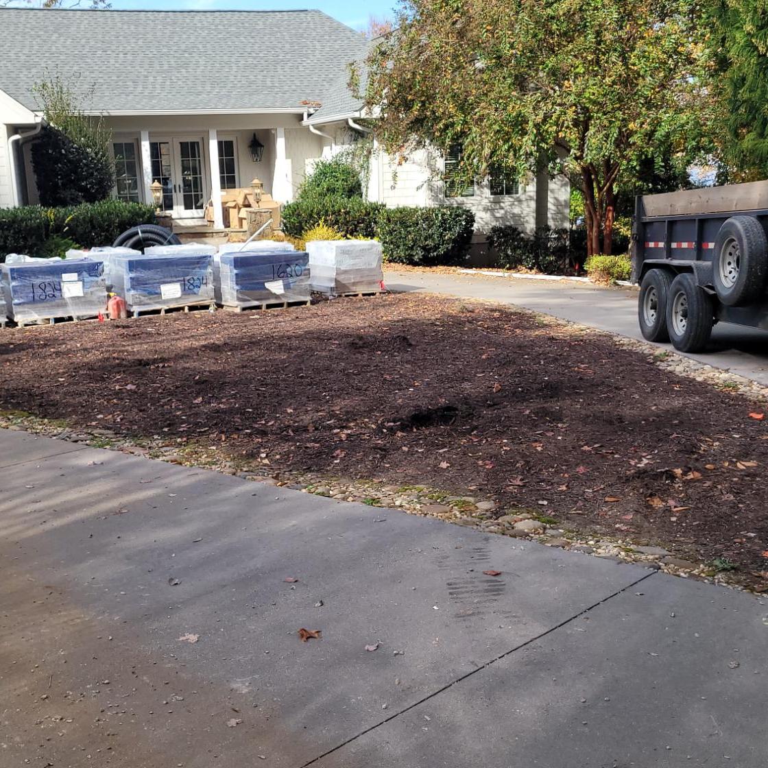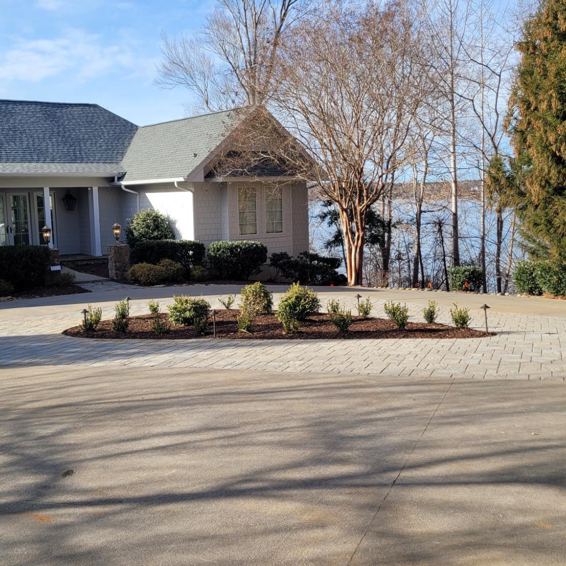 To widen the driveway, we installed a center island of vehicle rated Champlain Grey Eva pavers, and built a new garden bed with Wintergreen Boxwoods, Miss Huff Lantana, Goshiki Osmanthus, and accent plants, and finished it off with Dark Walnut Shredded mulch.