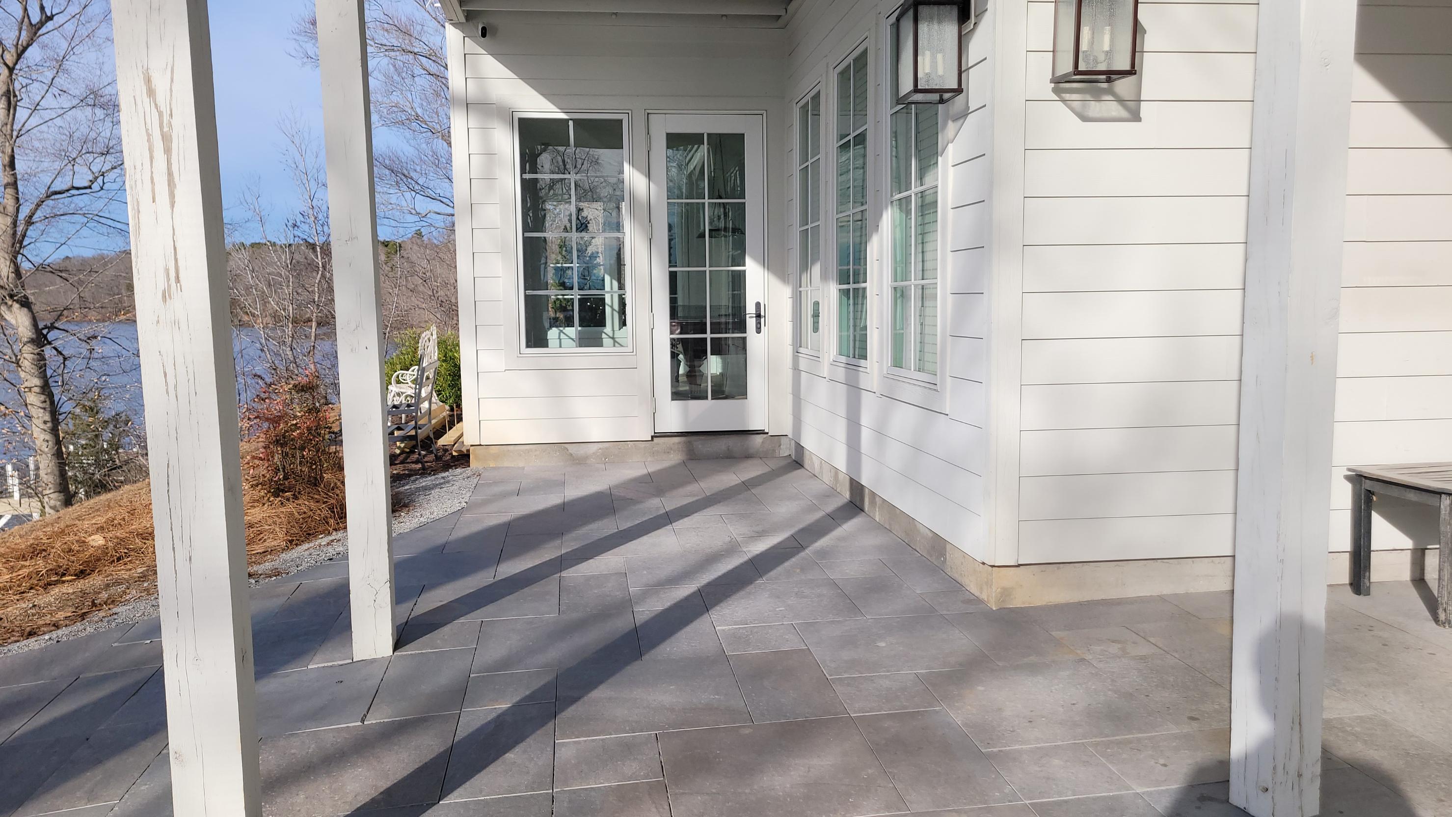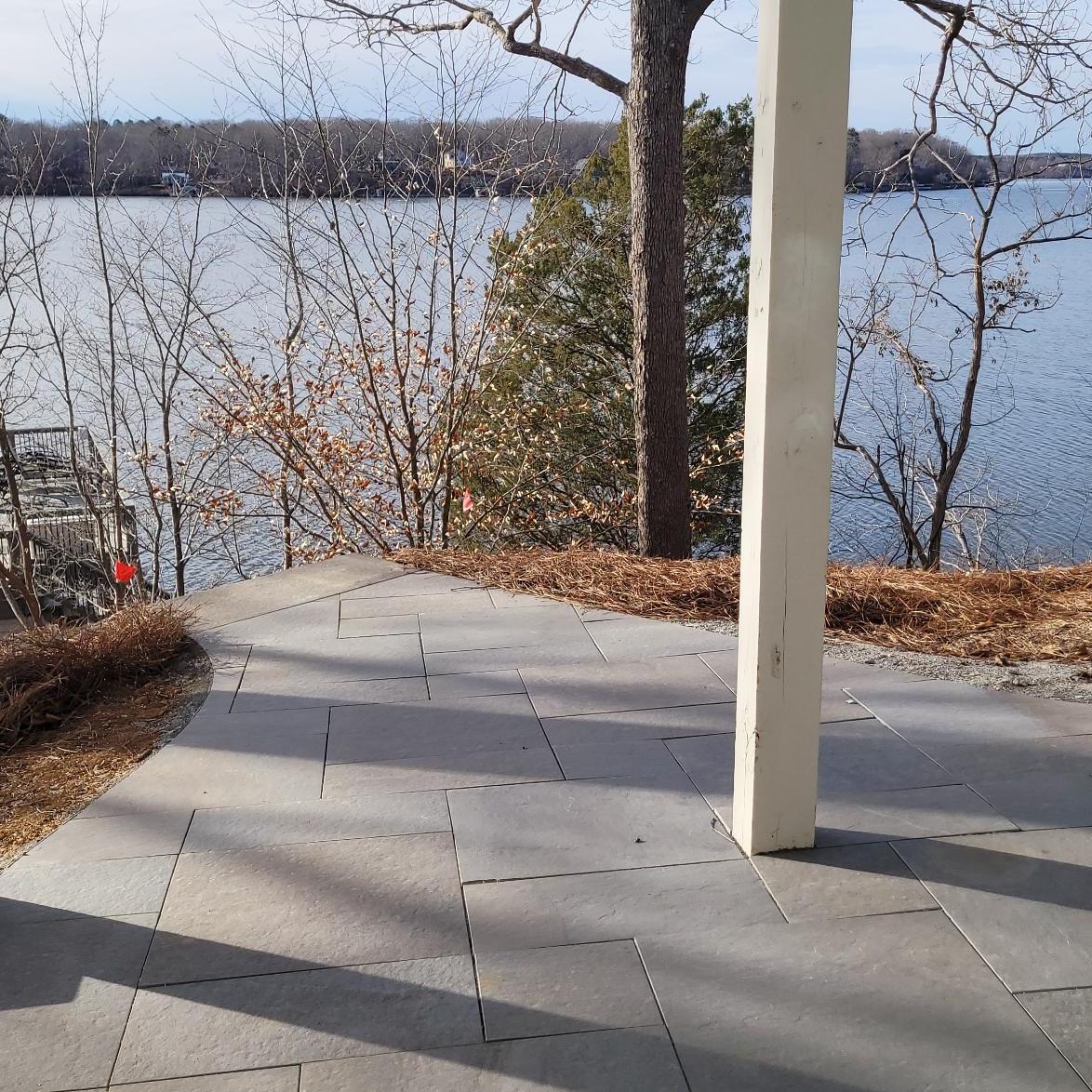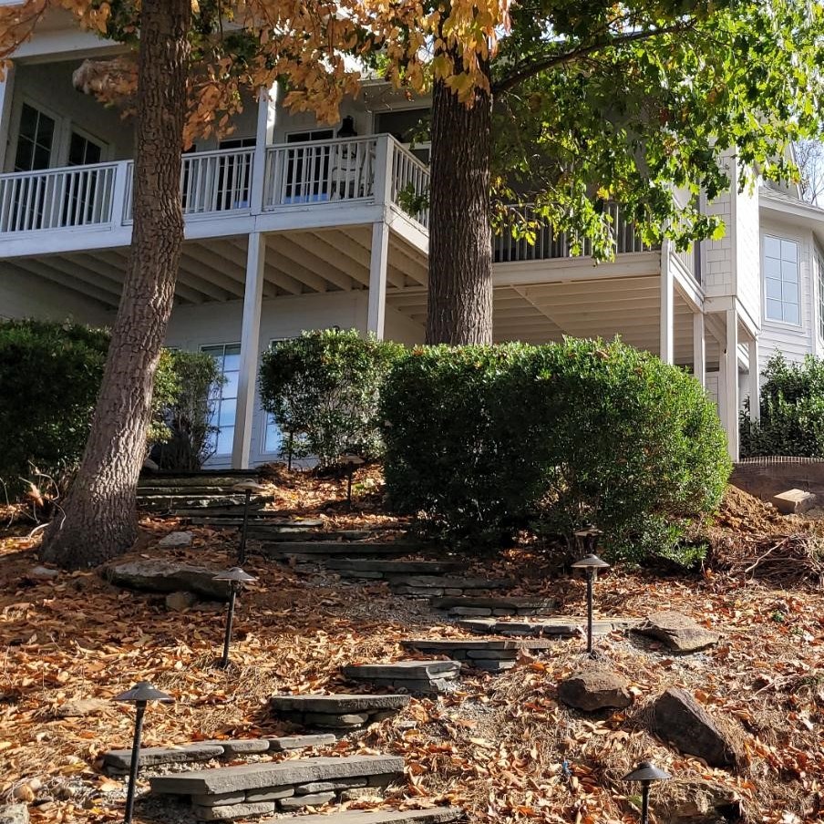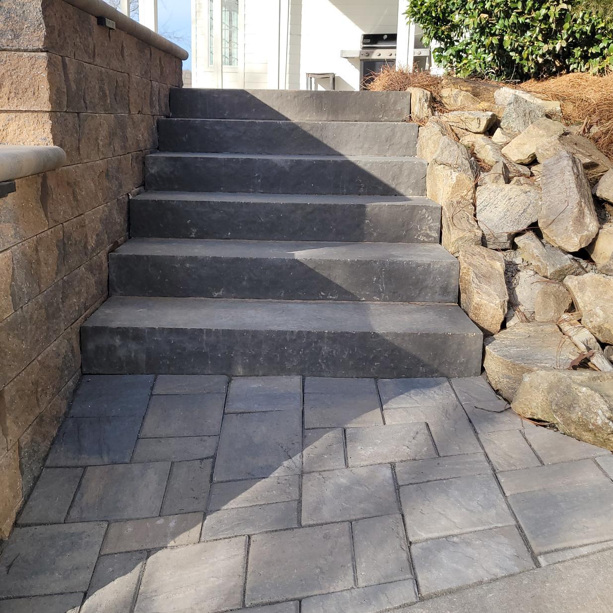 The patio connects to the golf cart path on one side and the boathouse on the down-slope with a series of solid grey stone slab steps. The steps beside the golf cart path are flanked by Sandlewood Mini Creta wing walls and natural small boulders.
