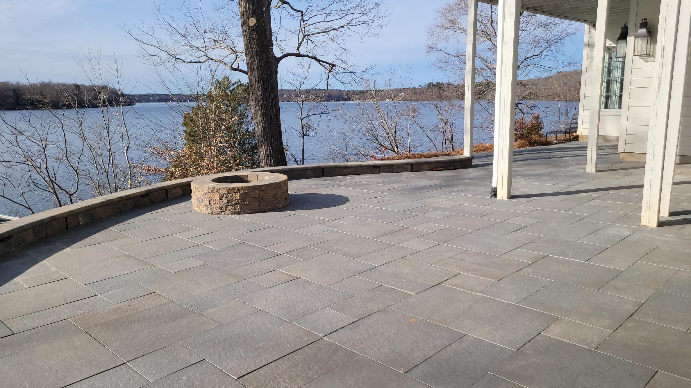Down the slope towards the back of the house is the newly installed patio. It is a half-moon shaped Everblue Full Color Variegated porcelain paver patio. It includes a Sandlewood Valencia wood-burning fire pit adjacent to the front center retaining wall.