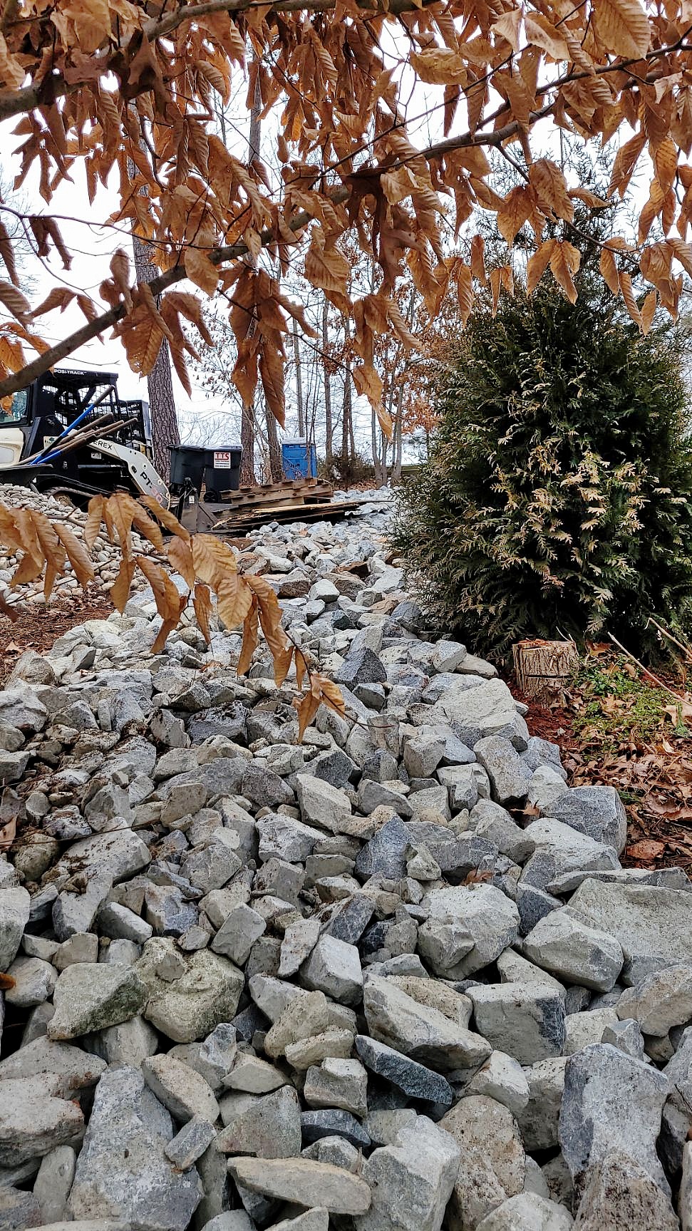 This project put all of the above together, rip-rap and retaining walls framing garden beds with both dark walnut shredded mulch and washed river rock, posted in Landscape & Hardscape.
