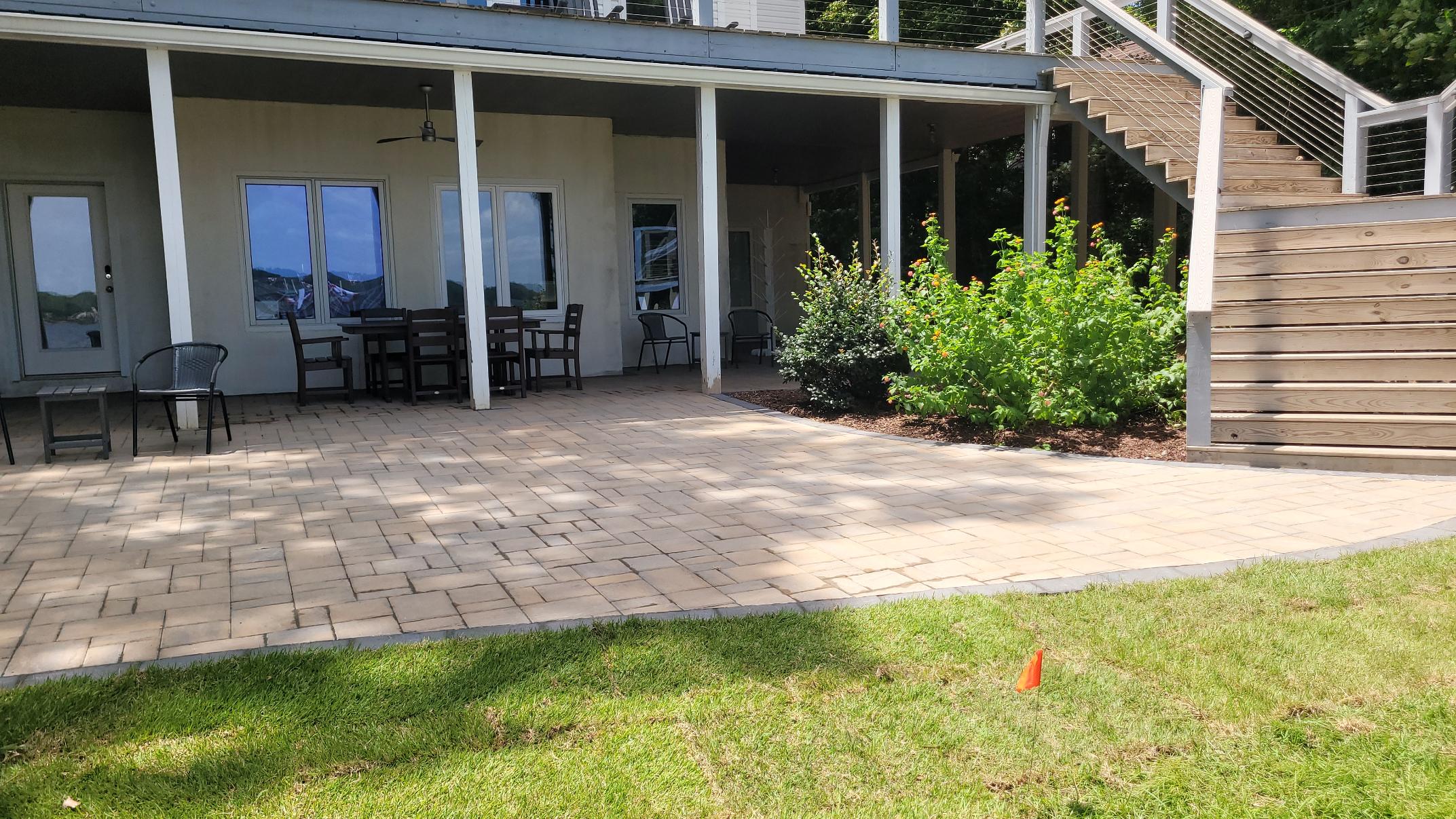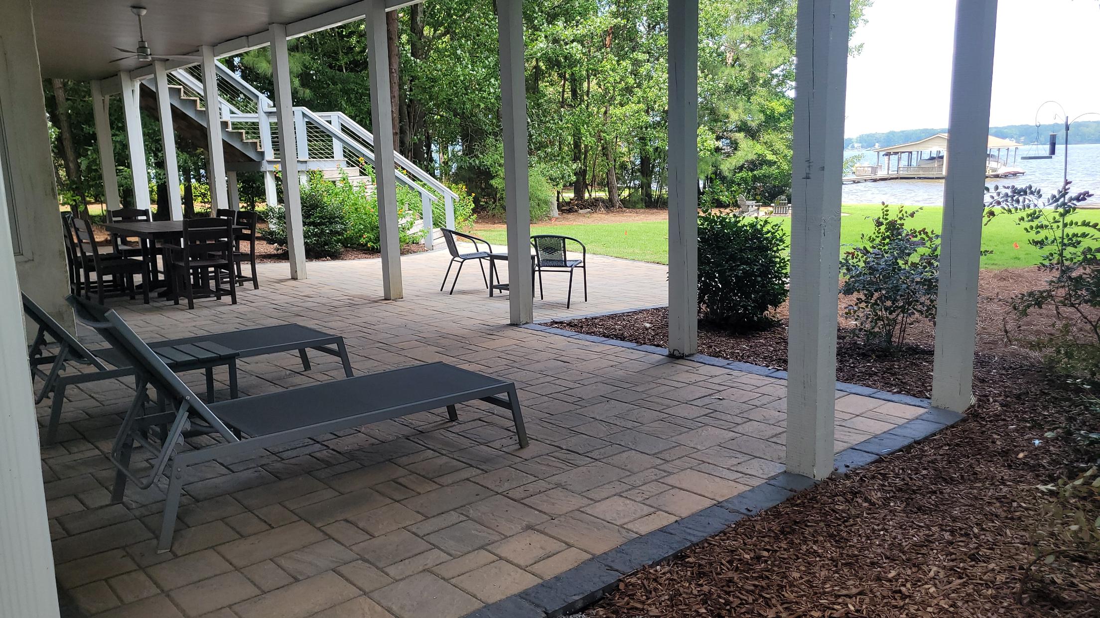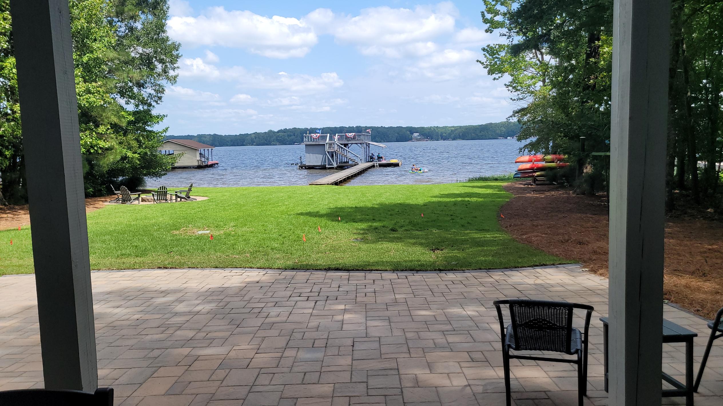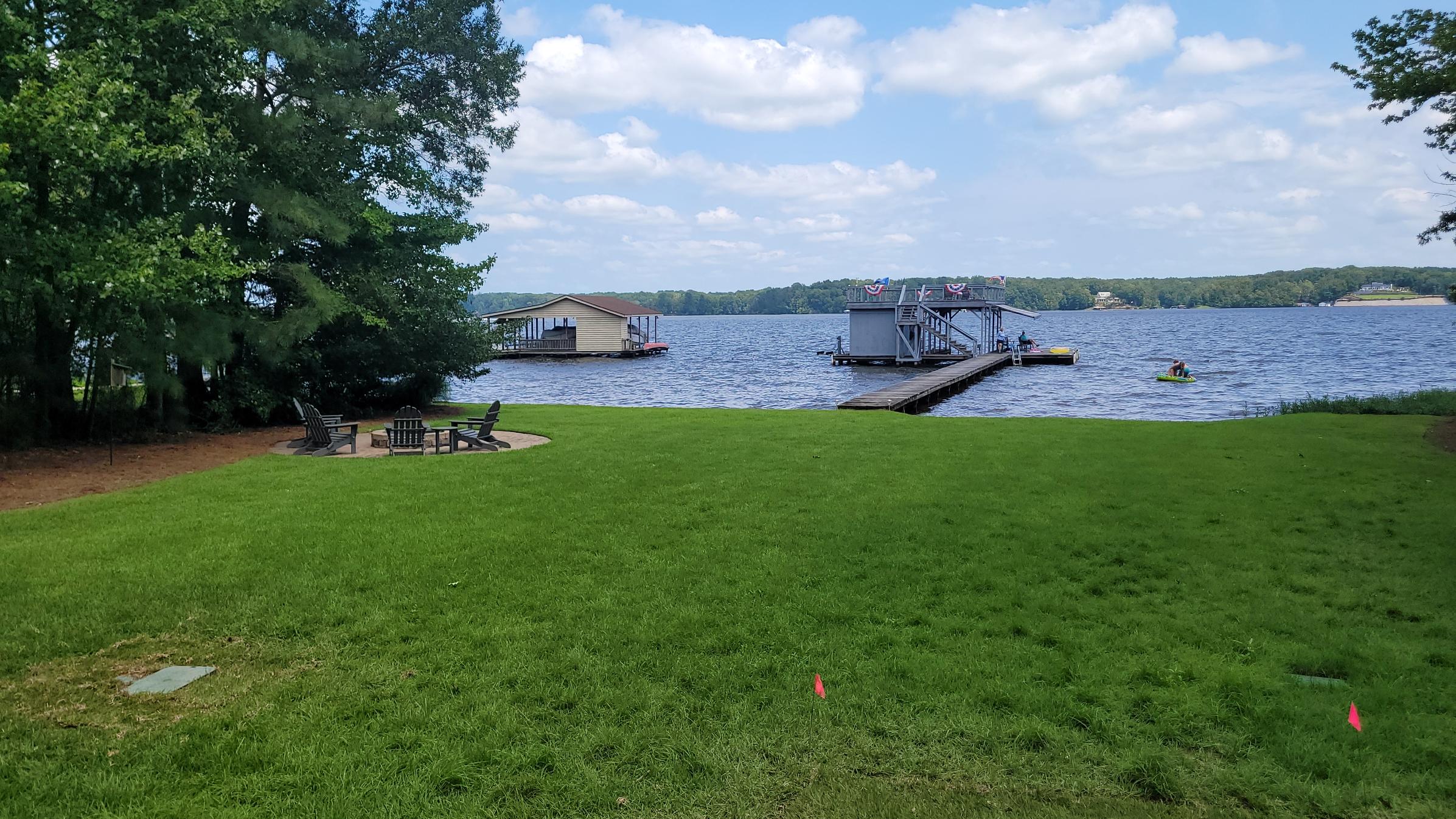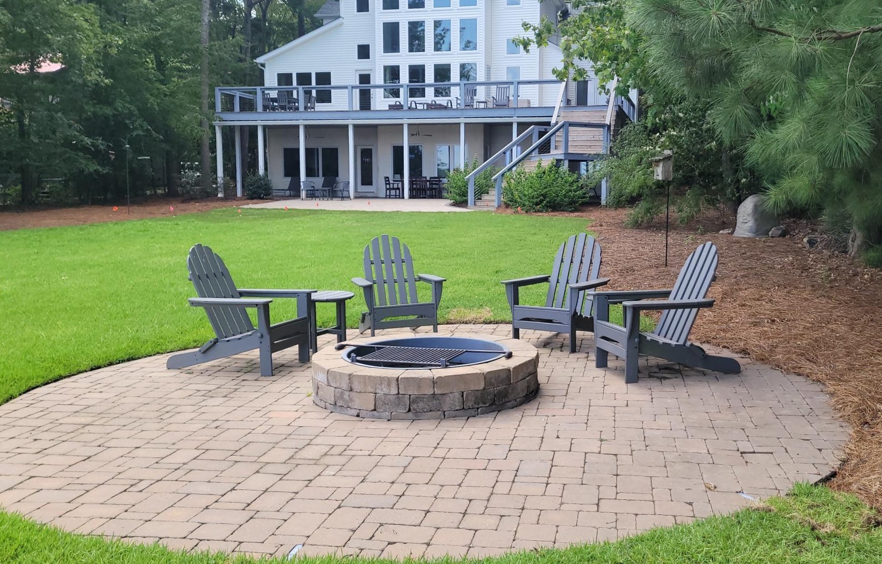 All of this work was for an existing customer. We were privileged to help him when he came to this area in 2019, installing this lakeside lawn and the fire pit patio, among other things.
