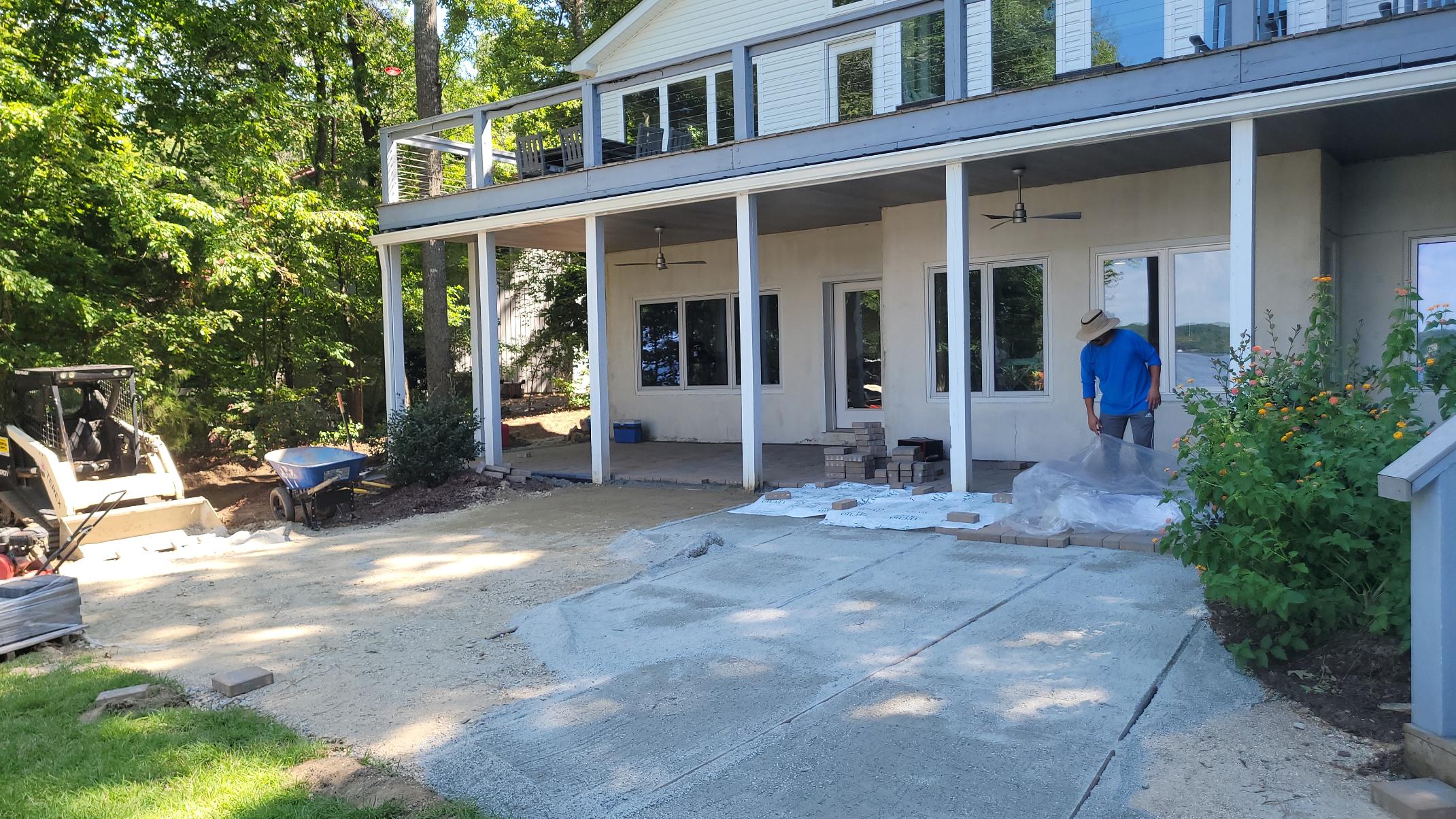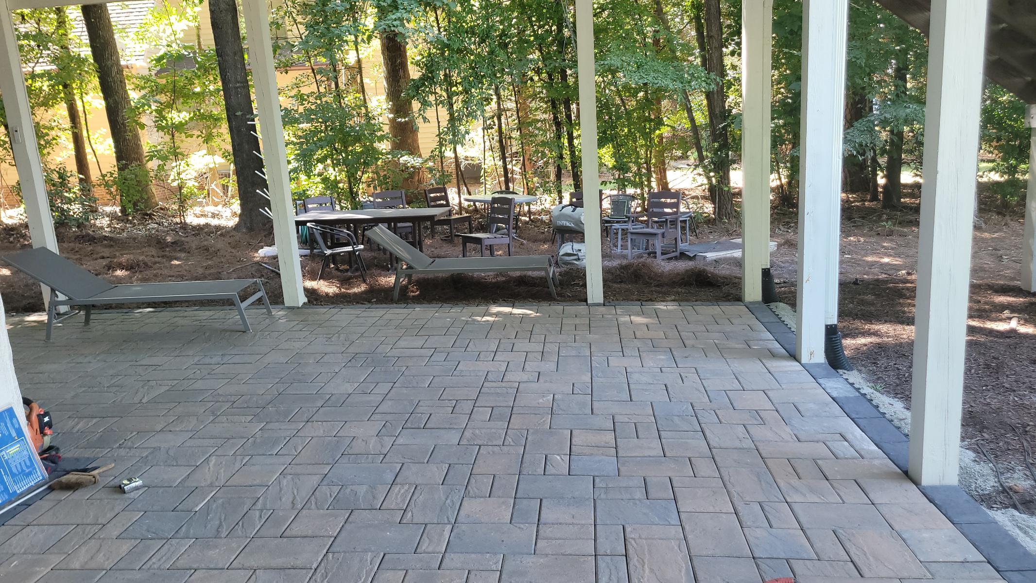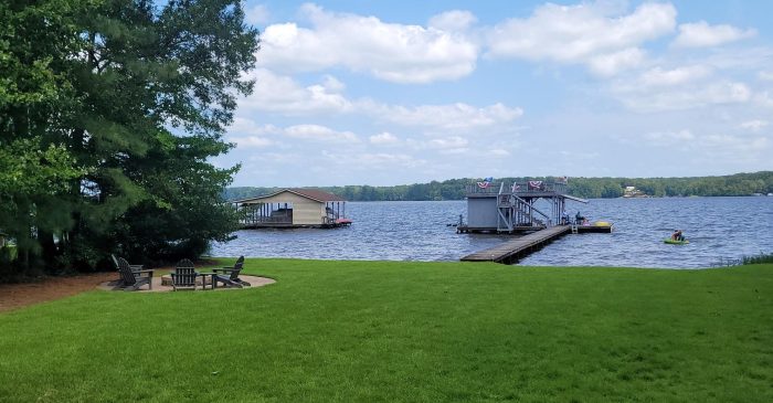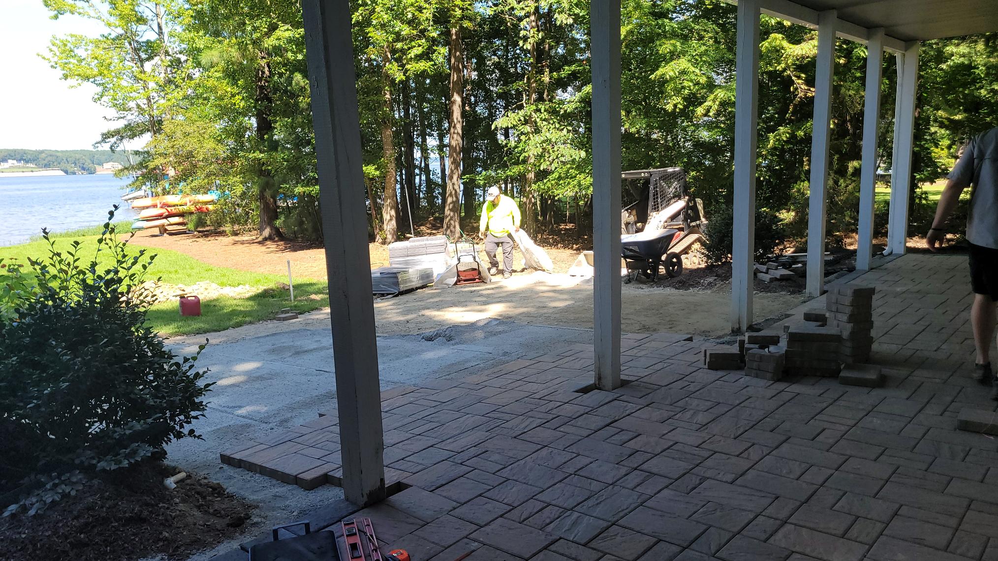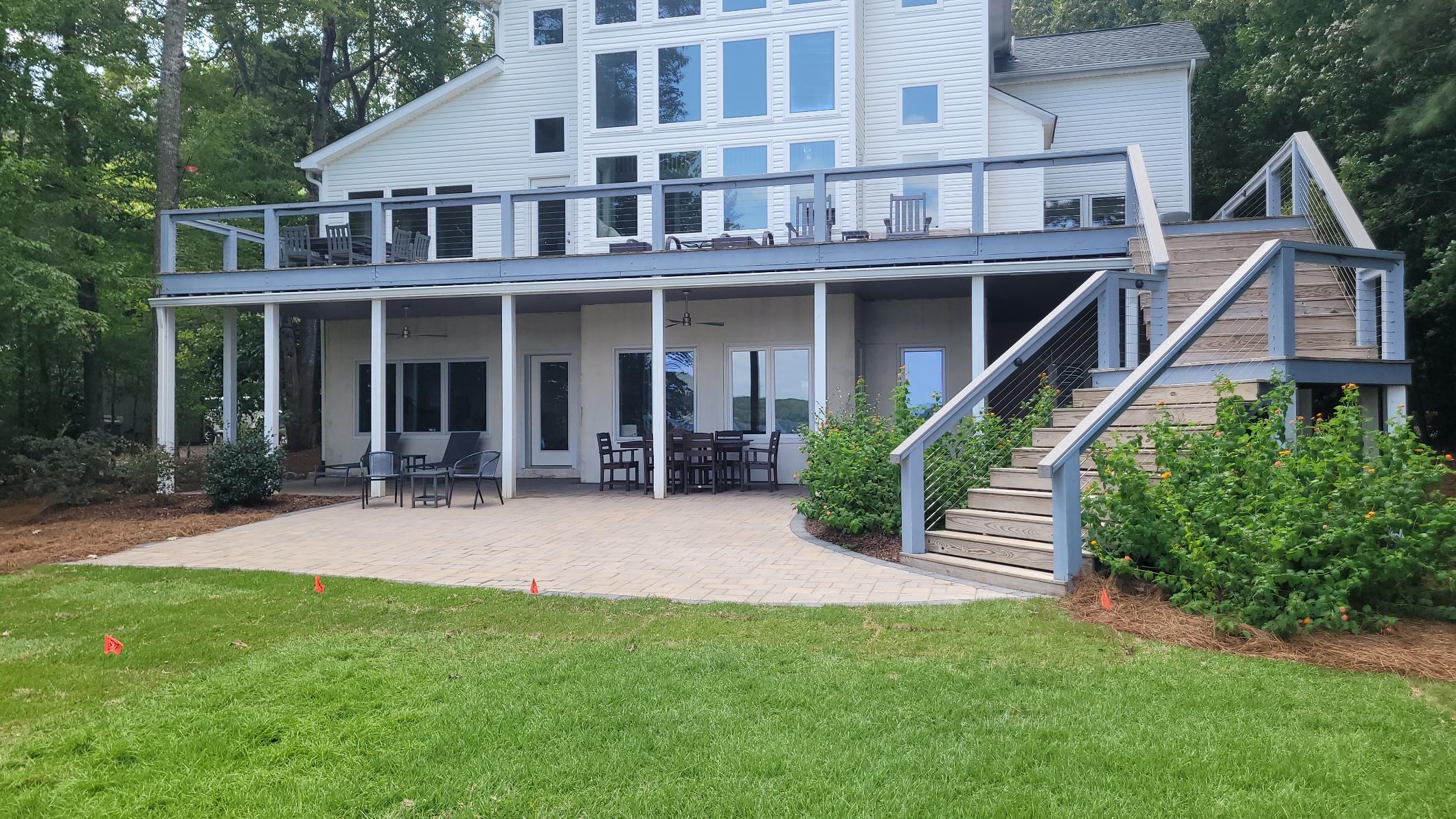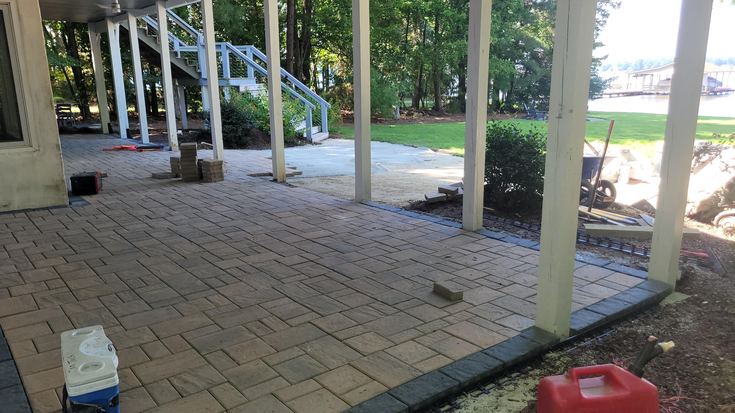 All of this work was for an existing customer. We were privileged to help him when he came to this area in 2019, installing this lakeside lawn and the fire pit patio, among other things.