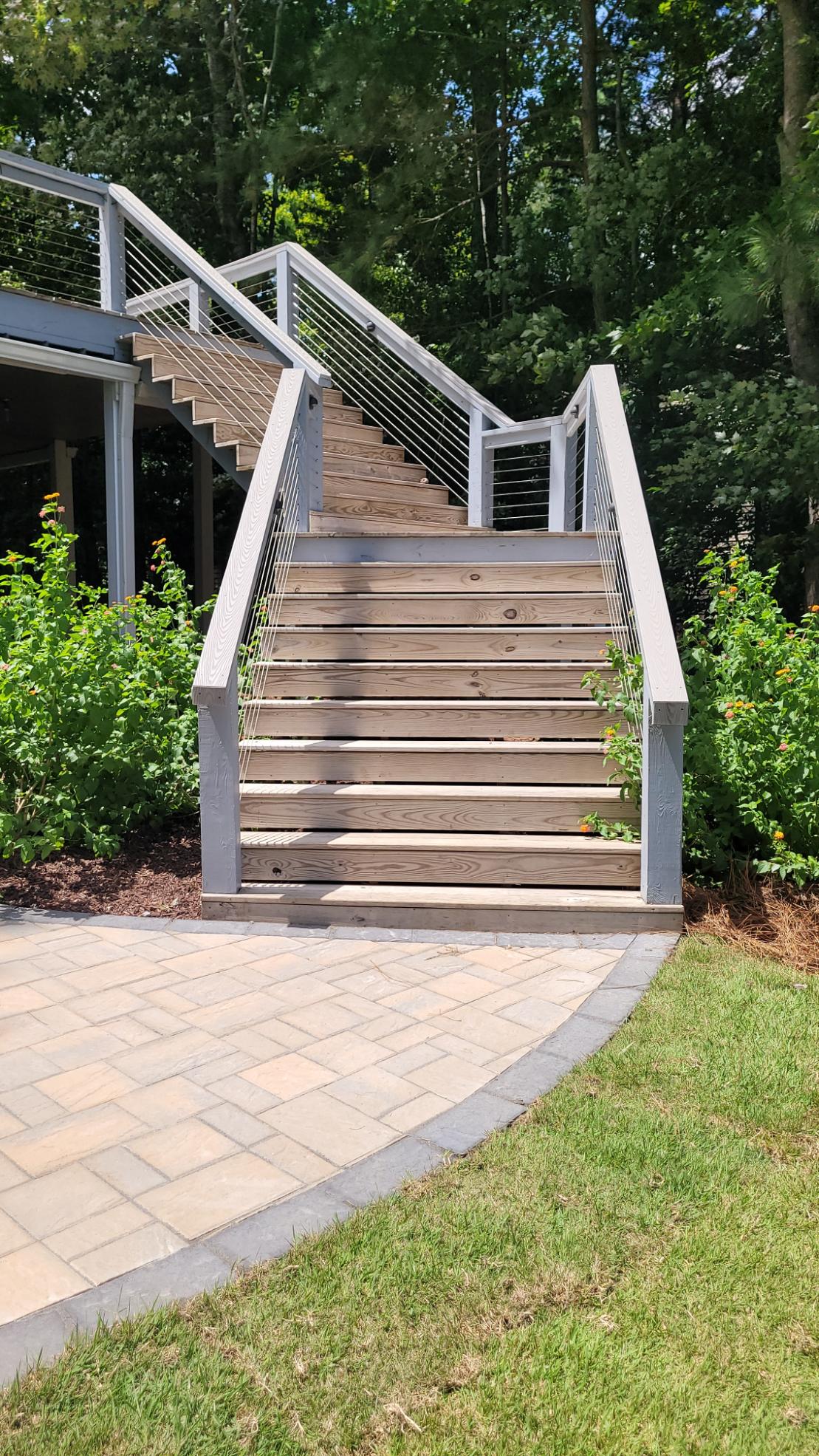 This is a Techo-Bloc Sandlewood Eva textured top paver patio with dark grey borders. The skill of our crews is exhibited in what you cannot see: one portion was installed on top of an existing concrete patio under the deck, while the base of the other is compacted gravel extending out into the yard. And yet, the “two” patios fit together seamlessly.