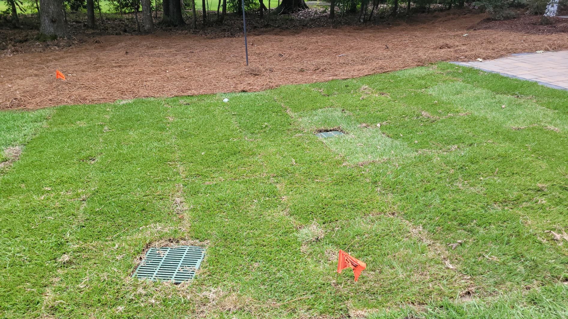 Finishing details included using excavated soils to blend the grade from the lakeside edge of the patio and Zenith Zoysia sod installed to cover the disturbed area. Drainage catch basins and existing irrigation heads were relocated to account for new water flows from the patio and the new turf design.
