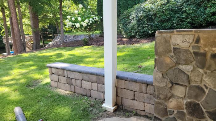 We have worked with this customer for many years. The paver patios and many of the plantings were originally installed by us. This Castle Manor Grana retaining wall with dark grey bullnose coping, for instance, was part of some work we did a few years ago to correct the drainage on the property.