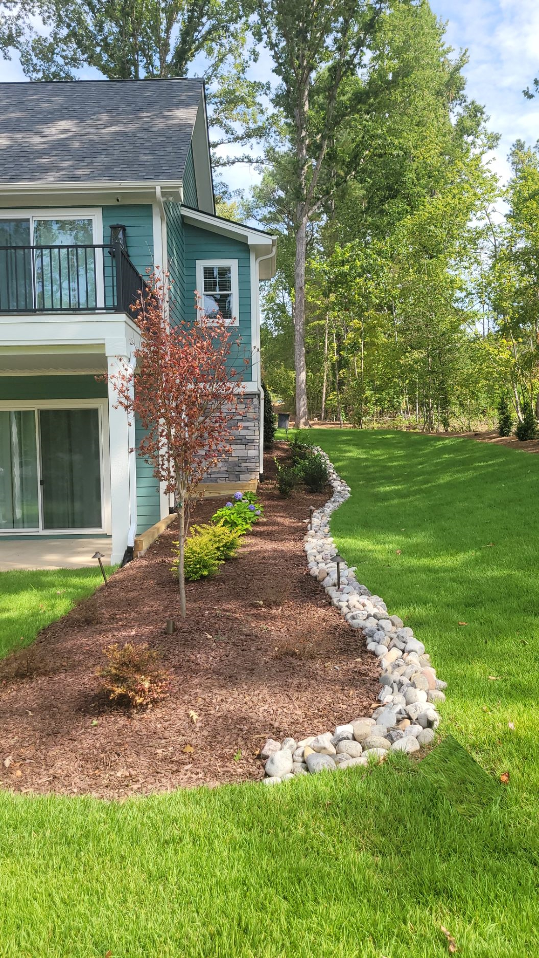 Garden beds in washed river rock, posted in Progress Report – New Sod, Plantings, Walkways, & More!