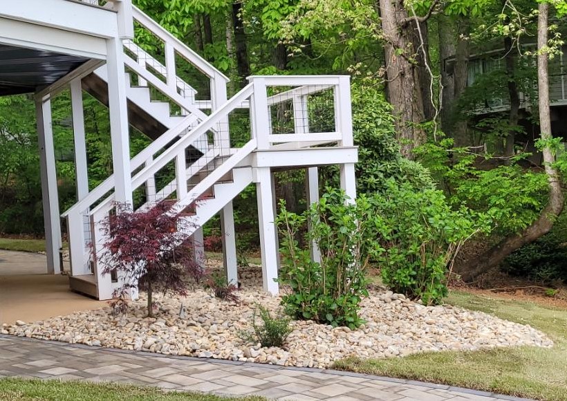 Washed river rock overlay of foundation ground guttering and washed stone fill-in under a deck, posted in Instant Gardens – and More.