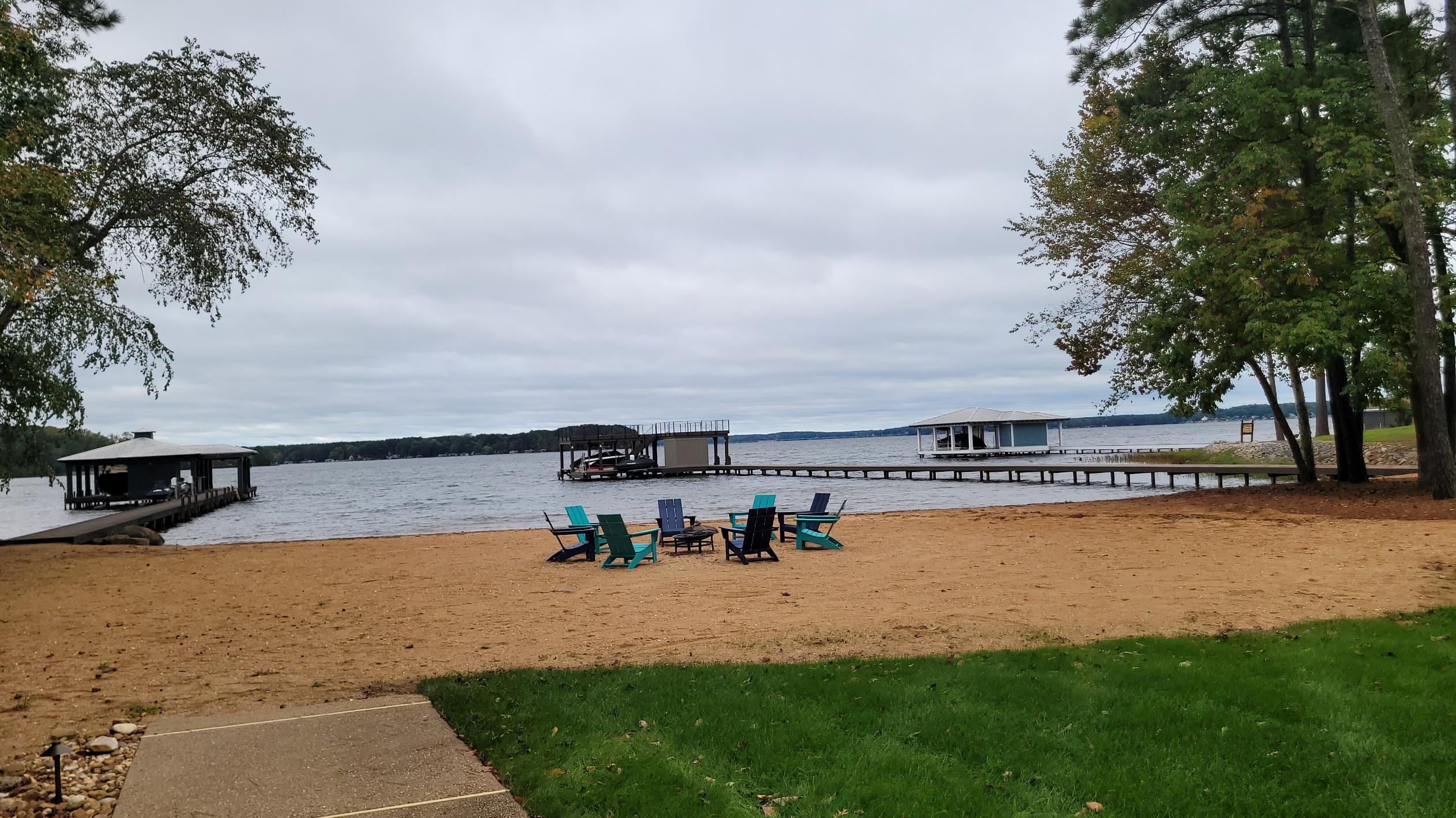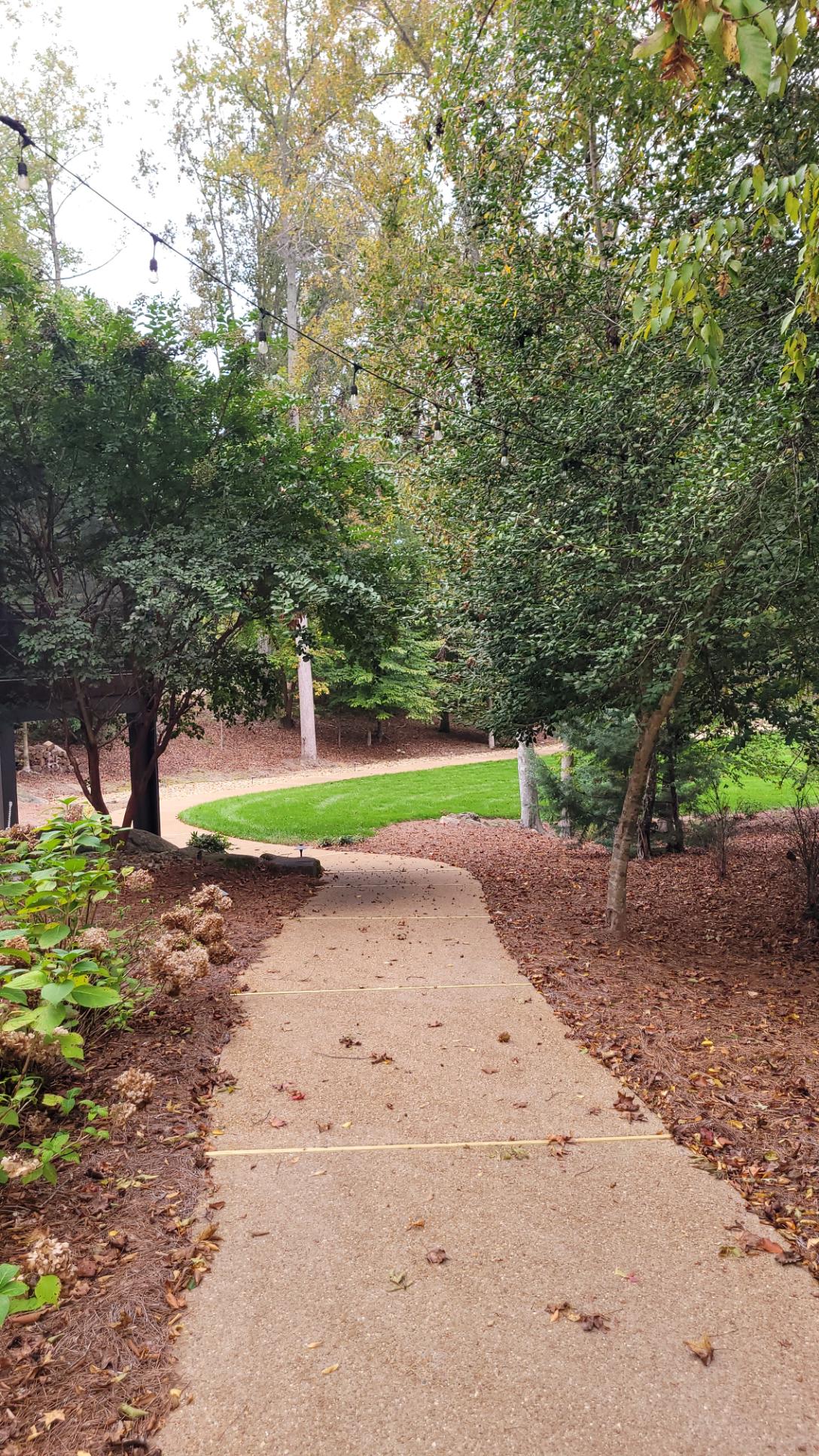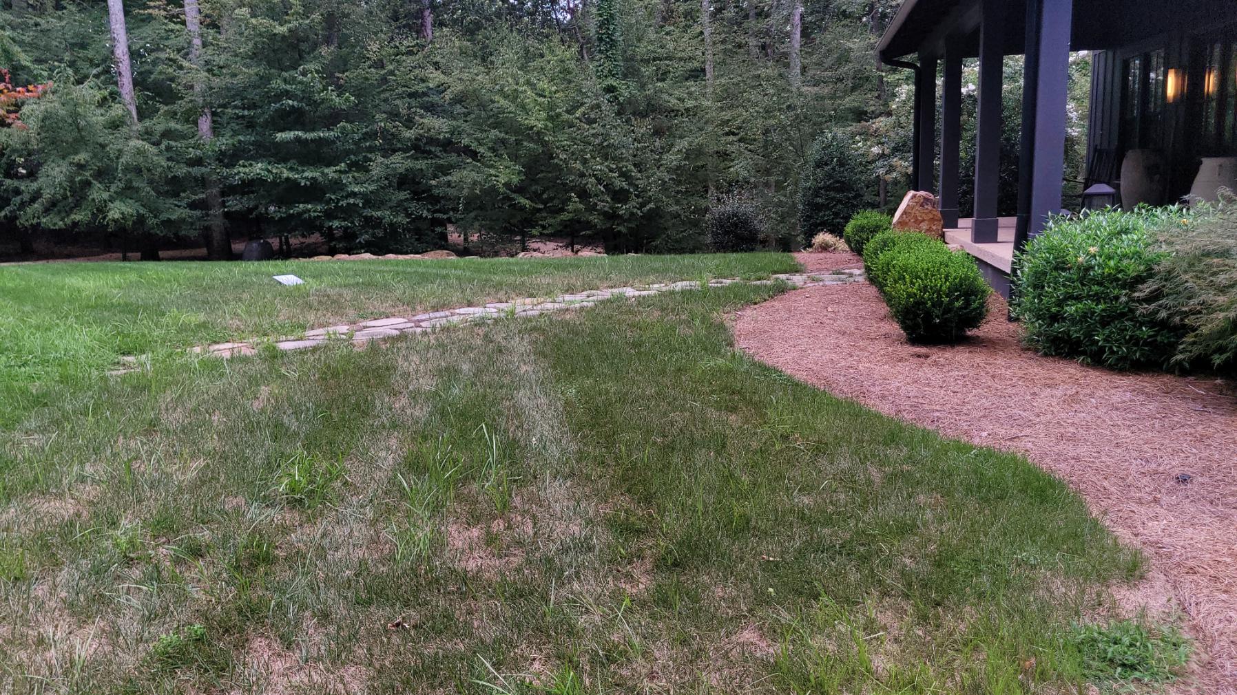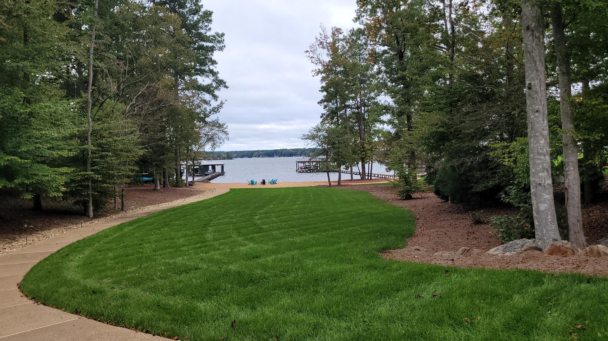 Here is the back yard with a Lake access walkway bordered by stone on the uphill side to mitigate erosion and drainage across the walkway.