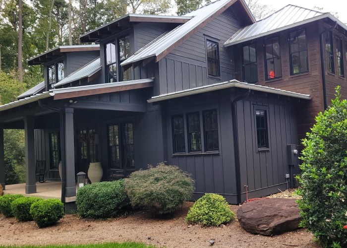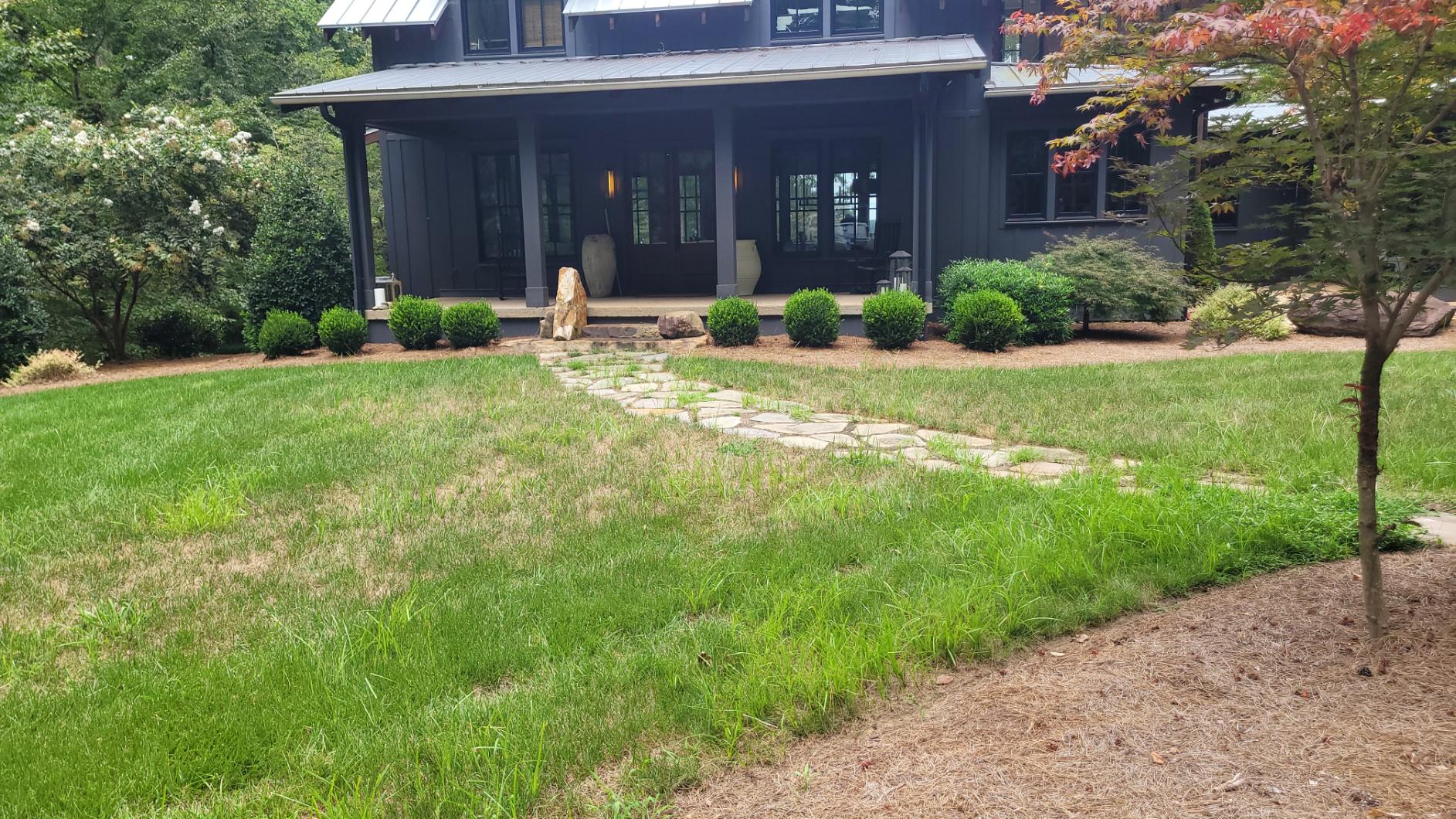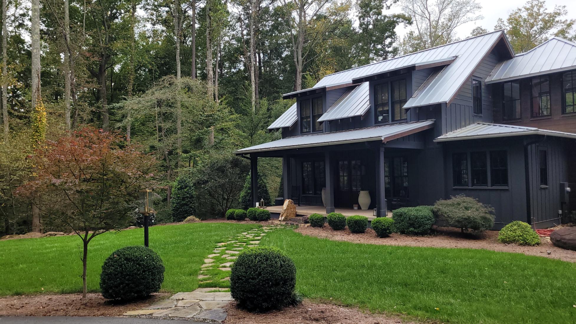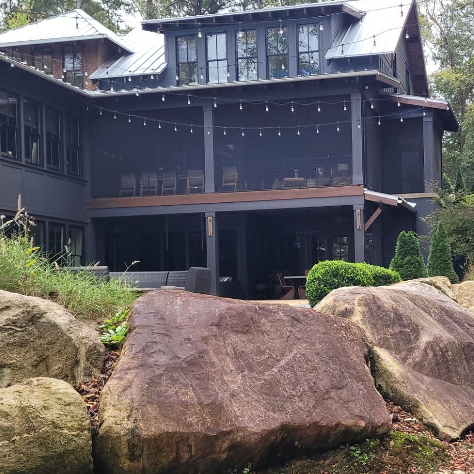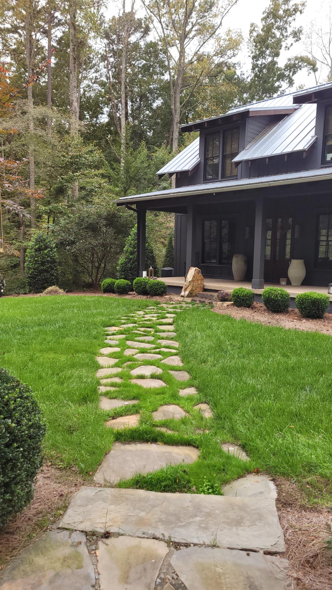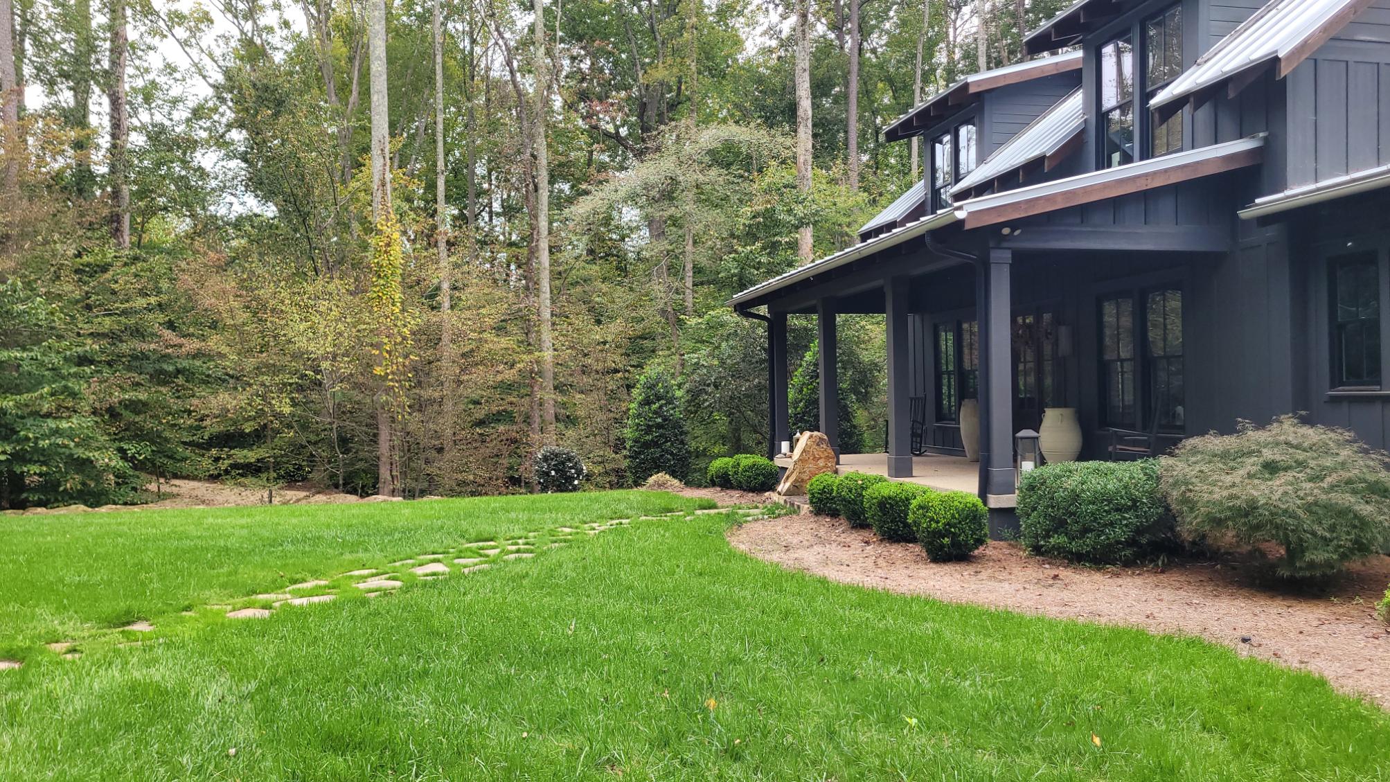 Overall design note: This is a classic mixed-evergreen series of plantings, with a unique use of boulders, rocks, and stones adding a natural esthetic to the landscape. Almost all landscape plantings are low-maintenance, deer-resistant, and tolerate well the heat/humidity of our North Carolina climate.