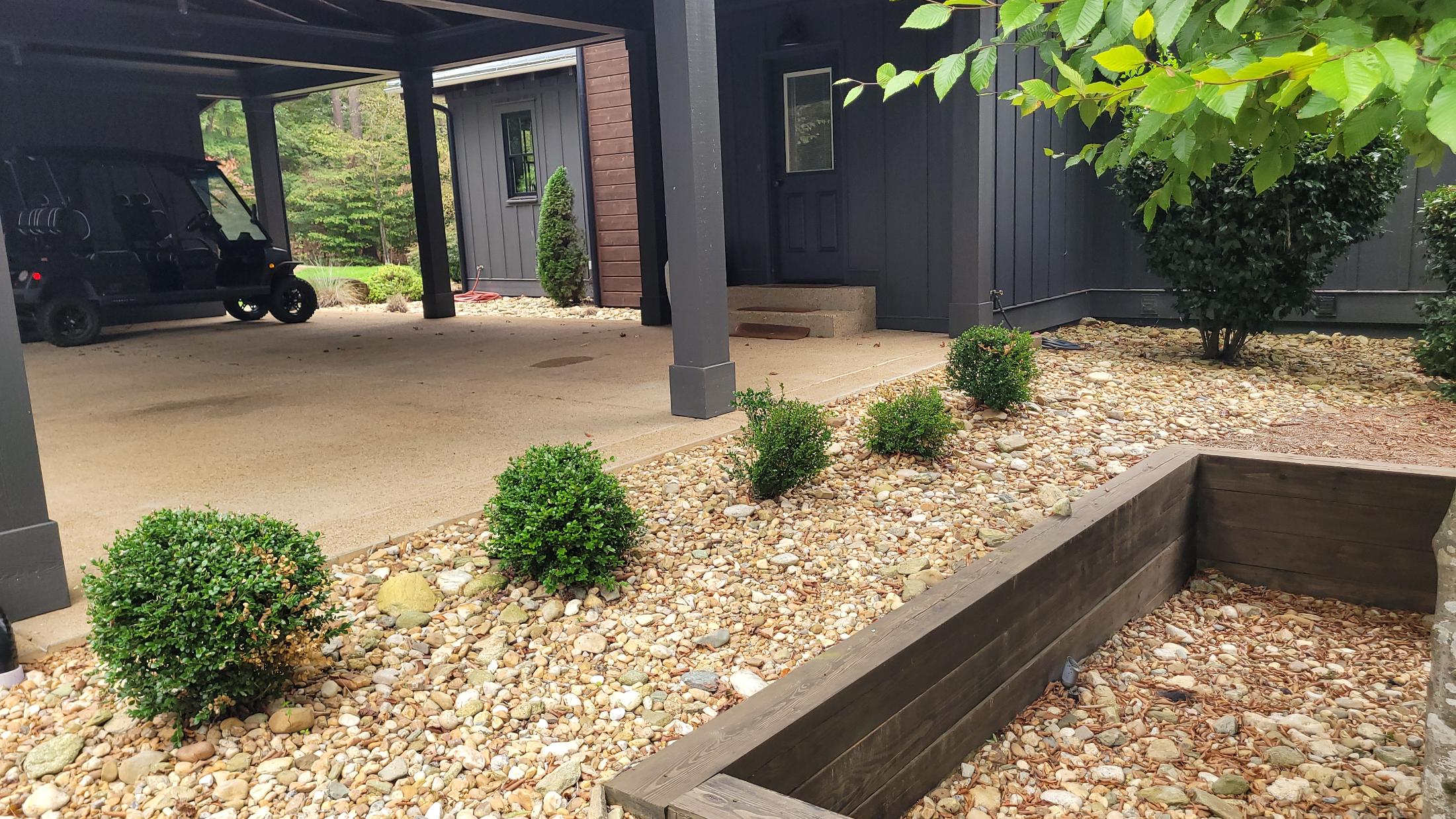 Beside the carport are Dwarf Boxwoods (Buxus), set in irregular beige stone mulch.