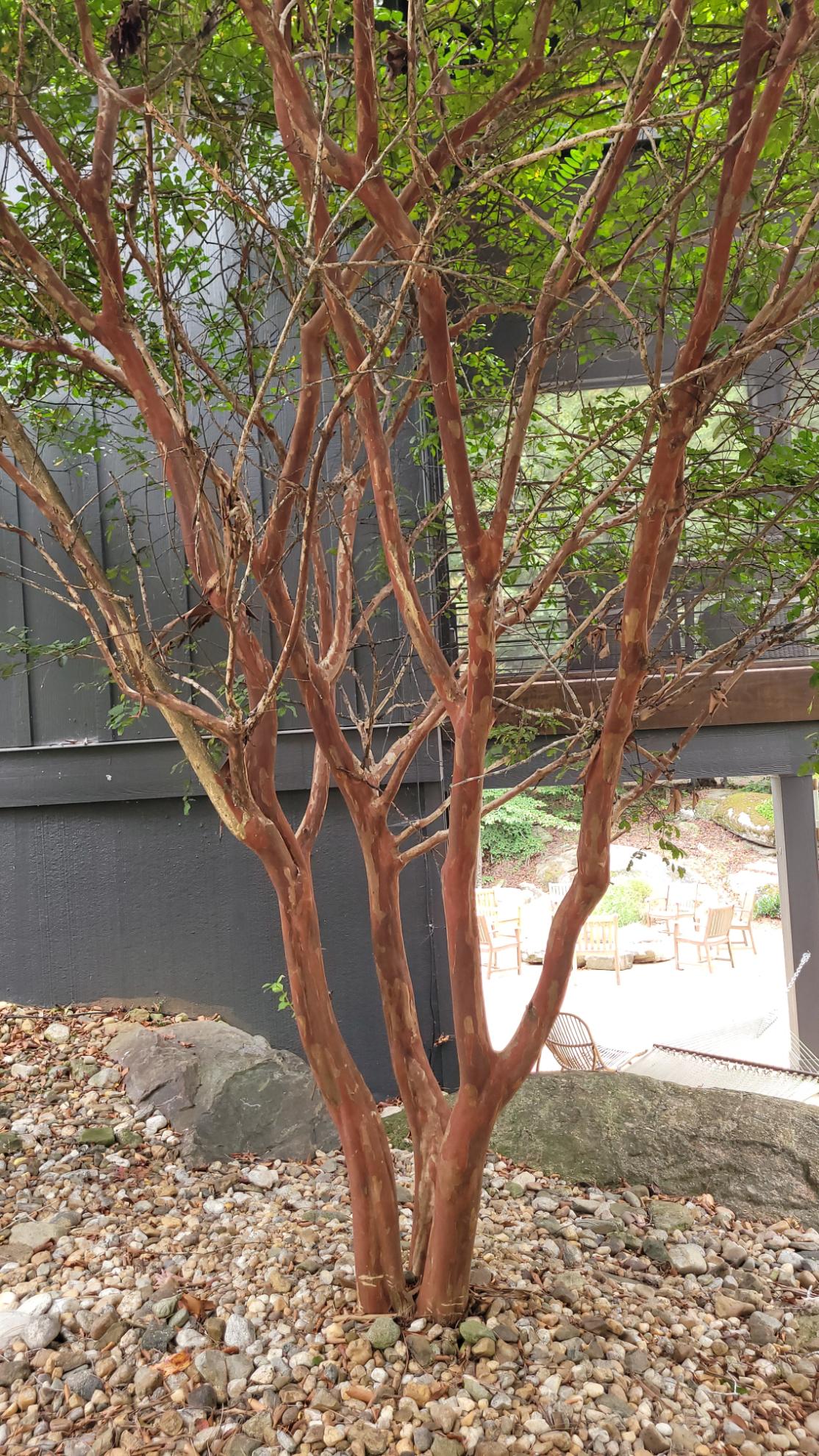 Heading down the path to the back yard we pass a beautiful, mature crape myrtle in irregular variegated stone mulch. Identification without the blooms is hard, but the bark pattern indicates it could be either ‘Natchez’ or ‘Tuscarora’, both of which are known for their attractive, peeling bark that reveals shades of cinnamon or reddish tones. ‘Natchez’ however is often lighter and mottled, so the richer reddish-brown hues indicate it is likely a ‘Tuscarora.’
