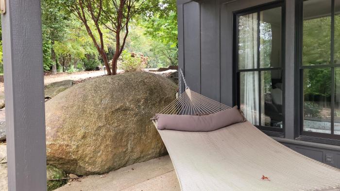 Shoring up the ground under the Crape Myrtle is a large boulder at the edge of the patio complex.