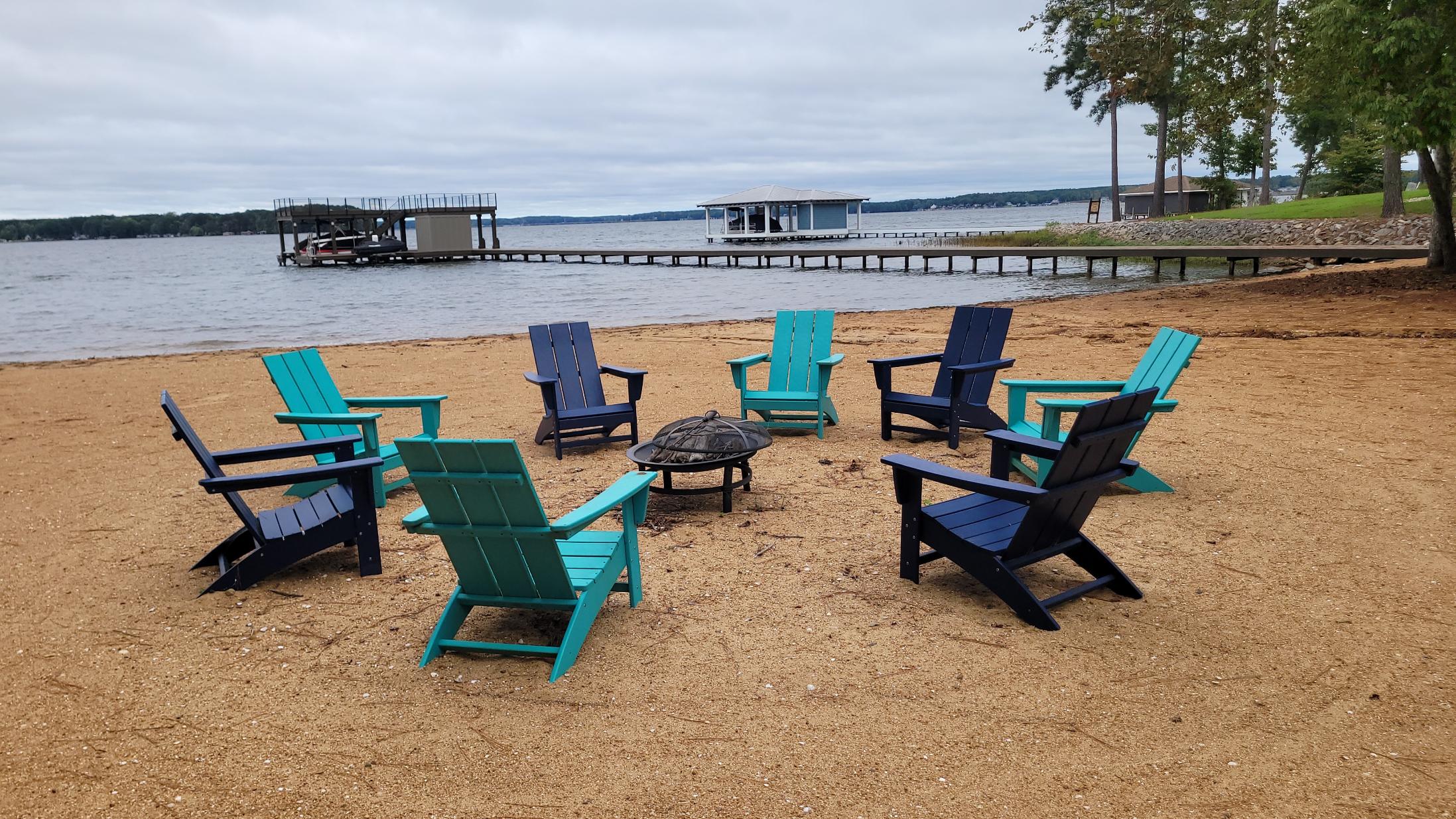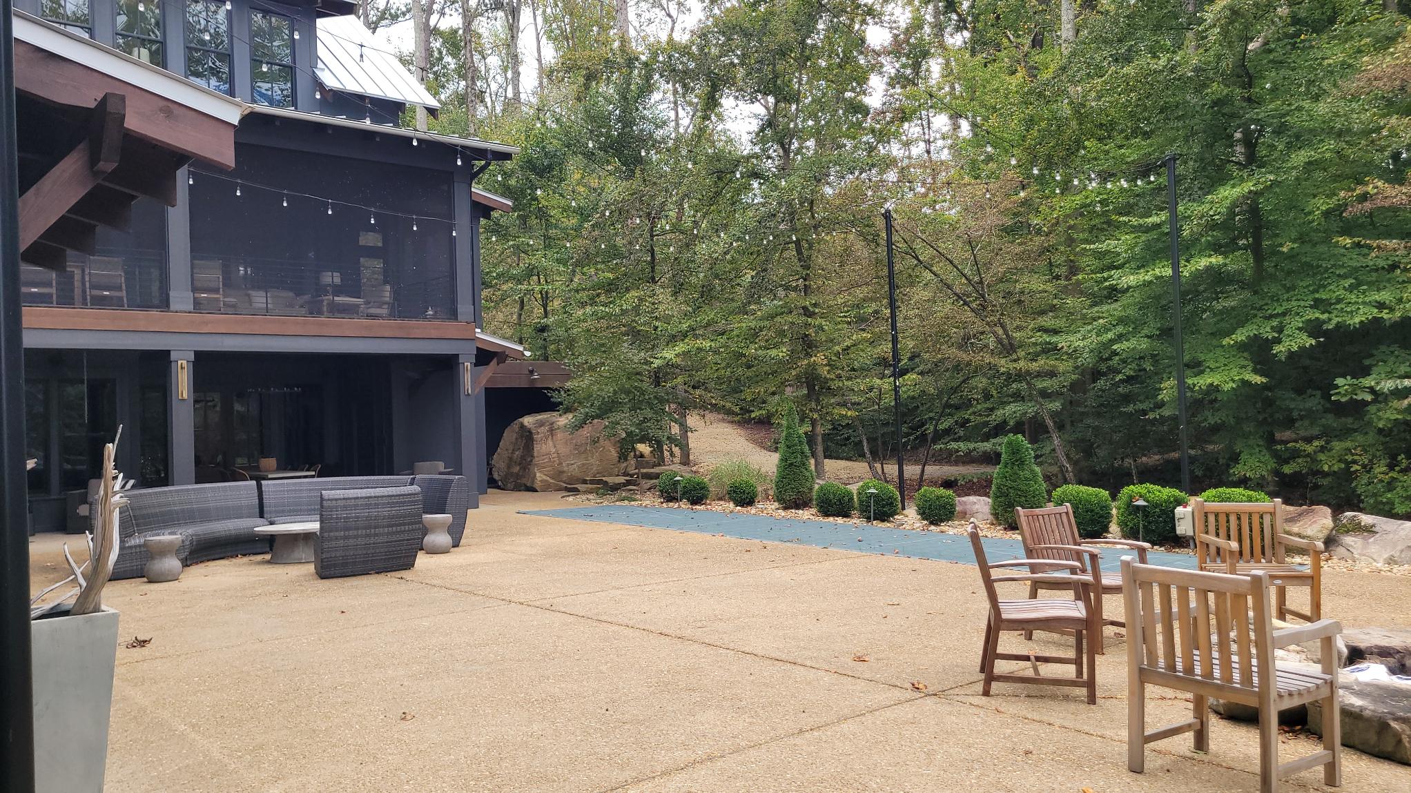 The patio comprises a sitting area, a fire pit, and shuffle board court, with a large boulder and rock formation anchoring the far corner. A specimen Japanese privet (Ligustrum Japonicum) presents on the Lake side of the patio. Along the edge of the patio are a row of shaped Boxwoods (Buxus) and an Emerald Green Arborvitae, all set in irregular variegated stone mulch and boulders.