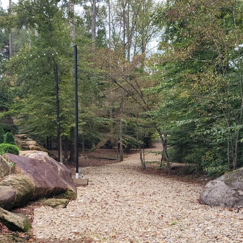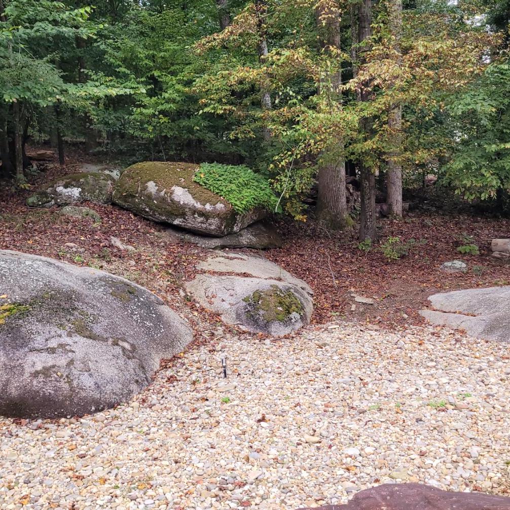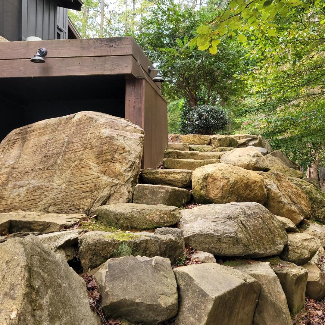 The Lake access drive adjacent the patio is composed of some 12 tons of compacted tan/white washed river rock, and is bordered with a formidable line of boulders. Notice also the stone steps seemingly formed out of a random group of rocks and boulders.