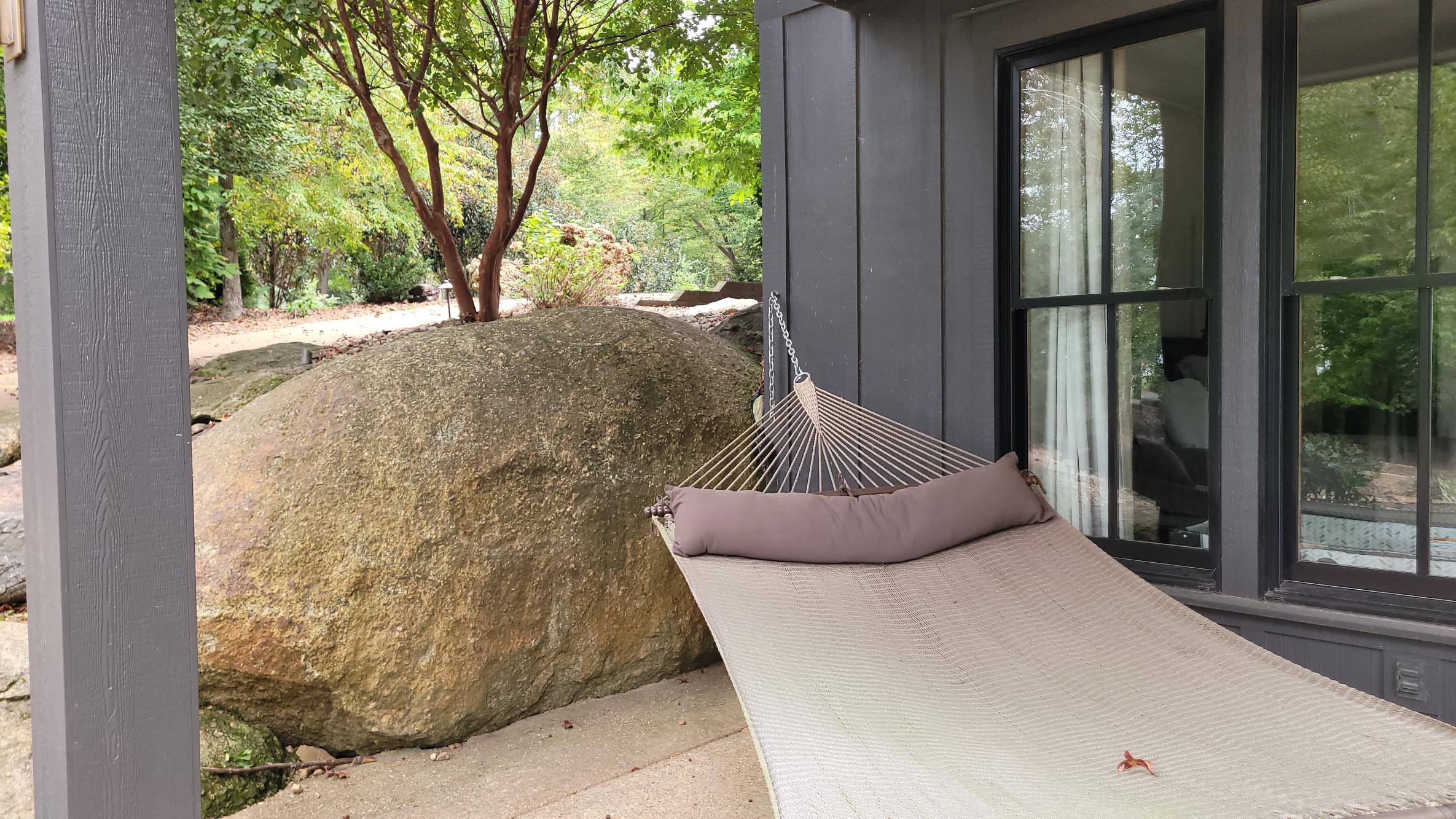 Note the strategic placement of a decorative rock at the front steps. This is a motif you will see as we go around the house, rocks, stones, and boulders (!) of various sizes and colors complementing the installed trees, plants, and shrubs.