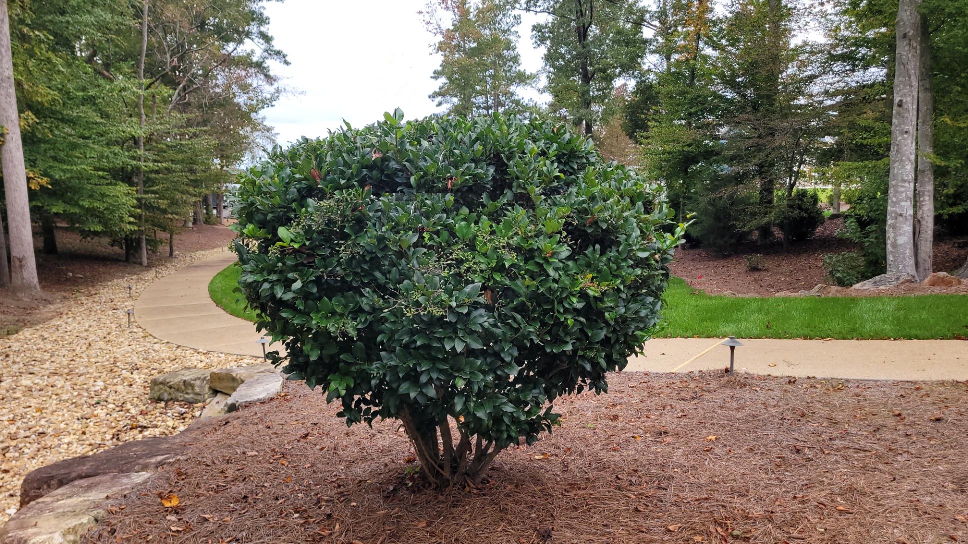 Overall design note: This is a classic mixed-evergreen series of plantings, with a unique use of boulders, rocks, and stones adding a natural esthetic to the landscape. Almost all landscape plantings are low-maintenance, deer-resistant, and tolerate well the heat/humidity of our North Carolina climate.