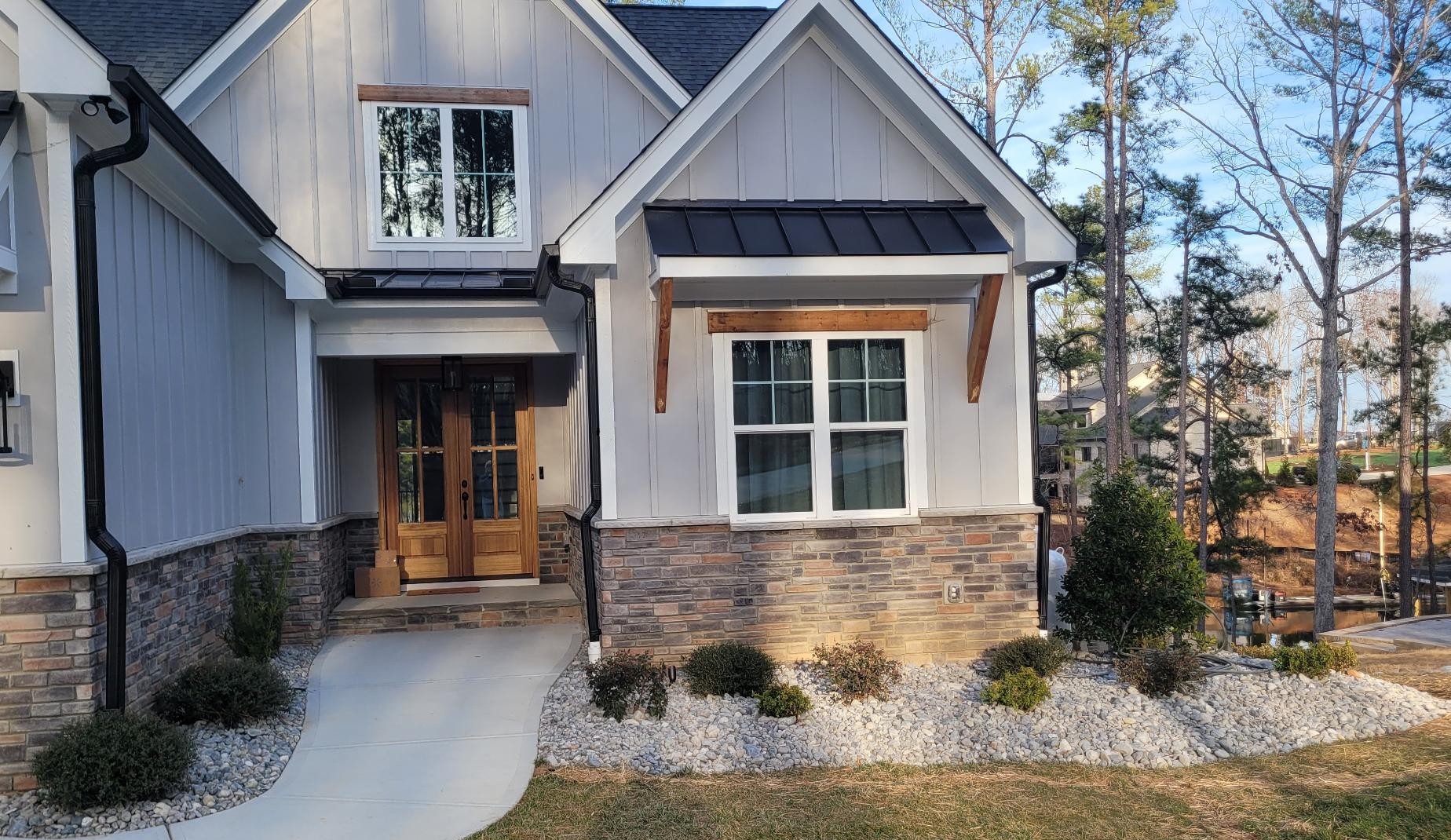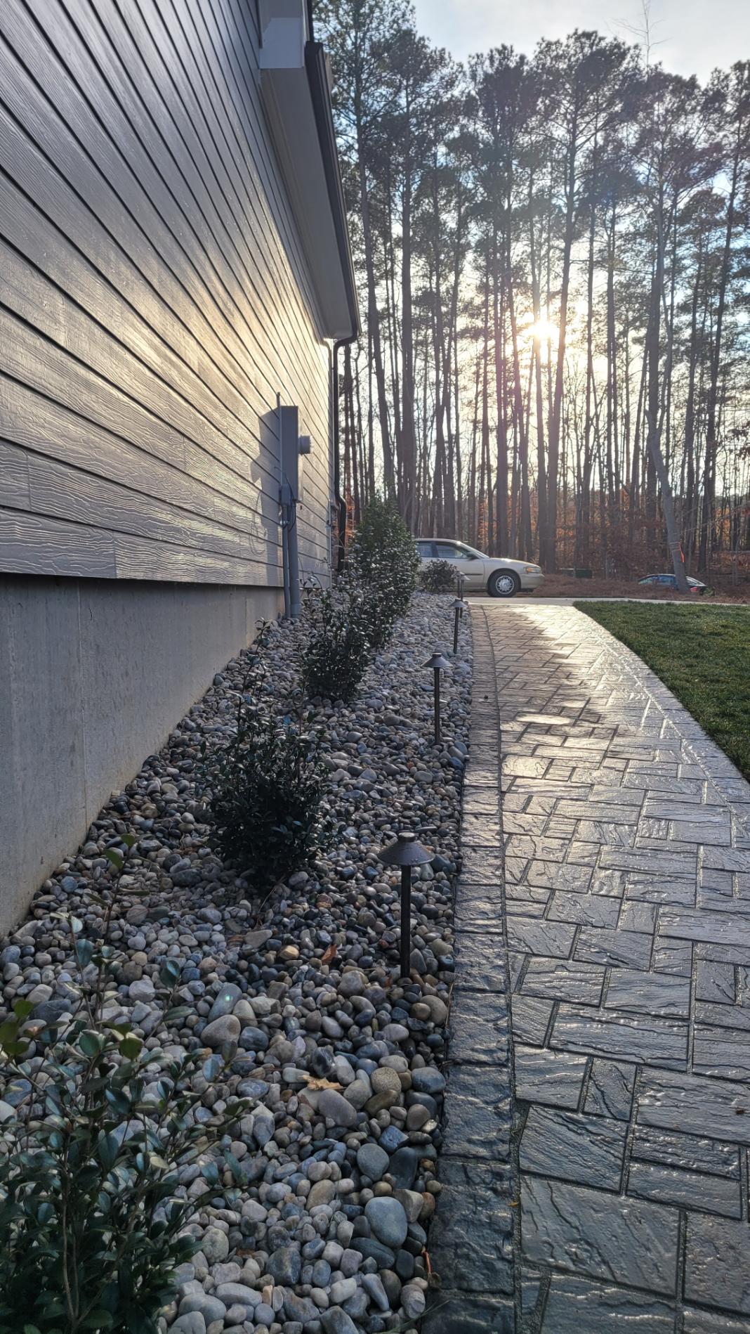 The walkways are 4′ wide Techo-Bloc Shale Grey Slate textured Eva paver sidewalks with Dark Grey Blue 60 border, complimenting the tan/grey/white shading of the river rock mulch.