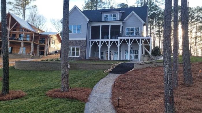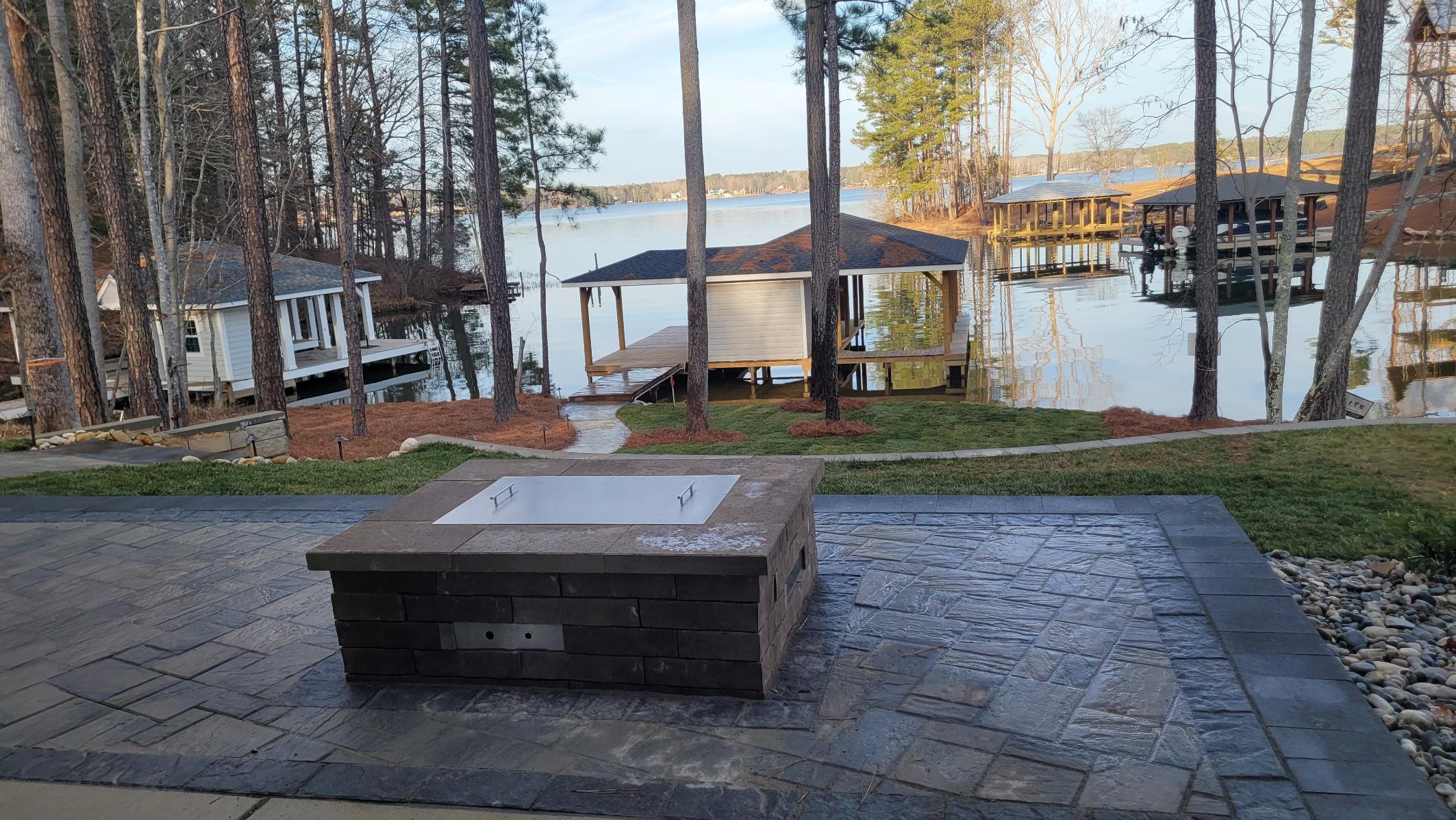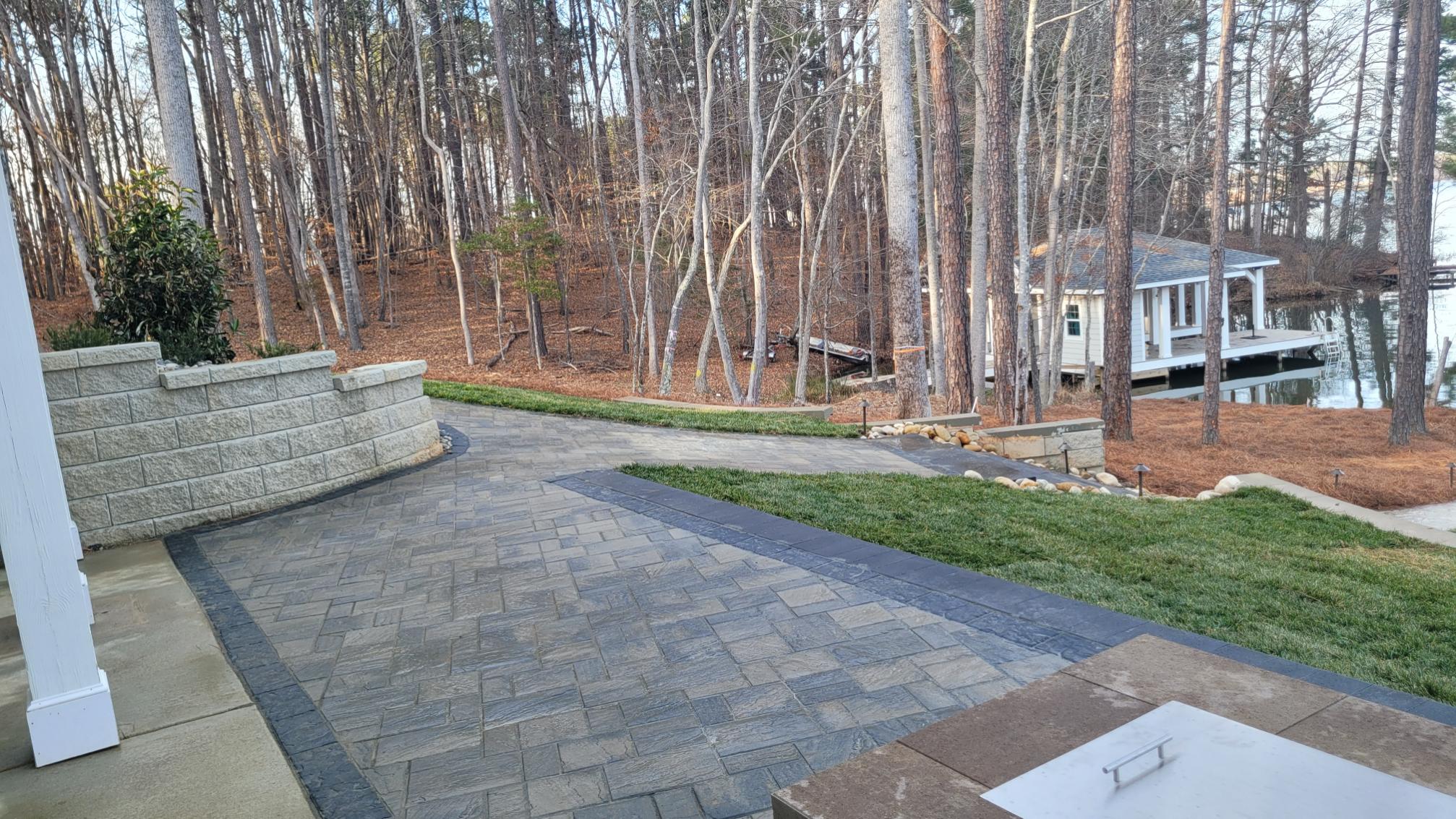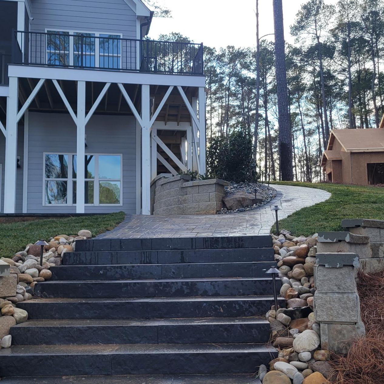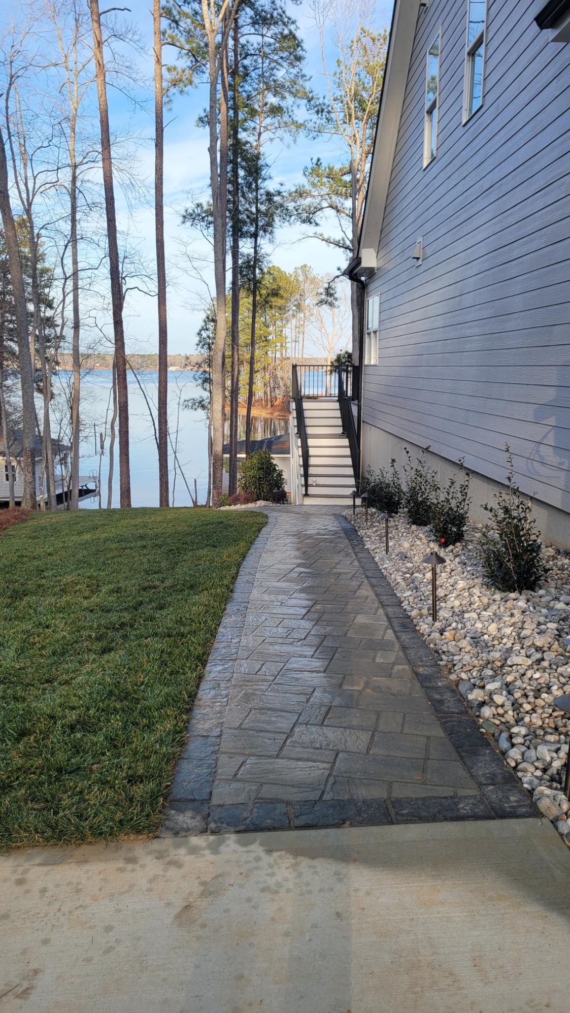 The Lake access walkway matches the patio and contains Belgard Dark Grey Solid Slab Steps to transition between the Lake-side existing retaining walls, connecting the upper turf area to the lower lakefront areas.