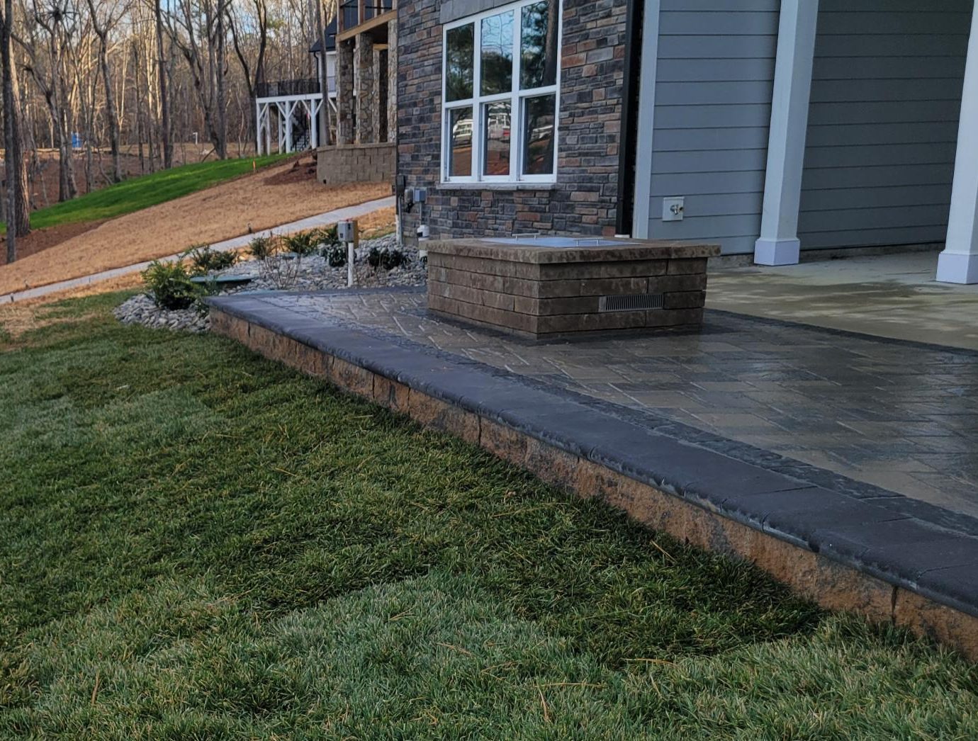 The Lake side patio matches the walkways with Techo-Bloc Shale Grey Slate textured Eva pavers and a Dark Grey Blue 60 border. It is supported by 6″ tall by 18′ long Techo-Bloc Sandlewood Brandon retaining wall along the side and Lake side of the patio. The rectangular gas fire pit is a Techo-Bloc Chestnut Brown Brandon design.
