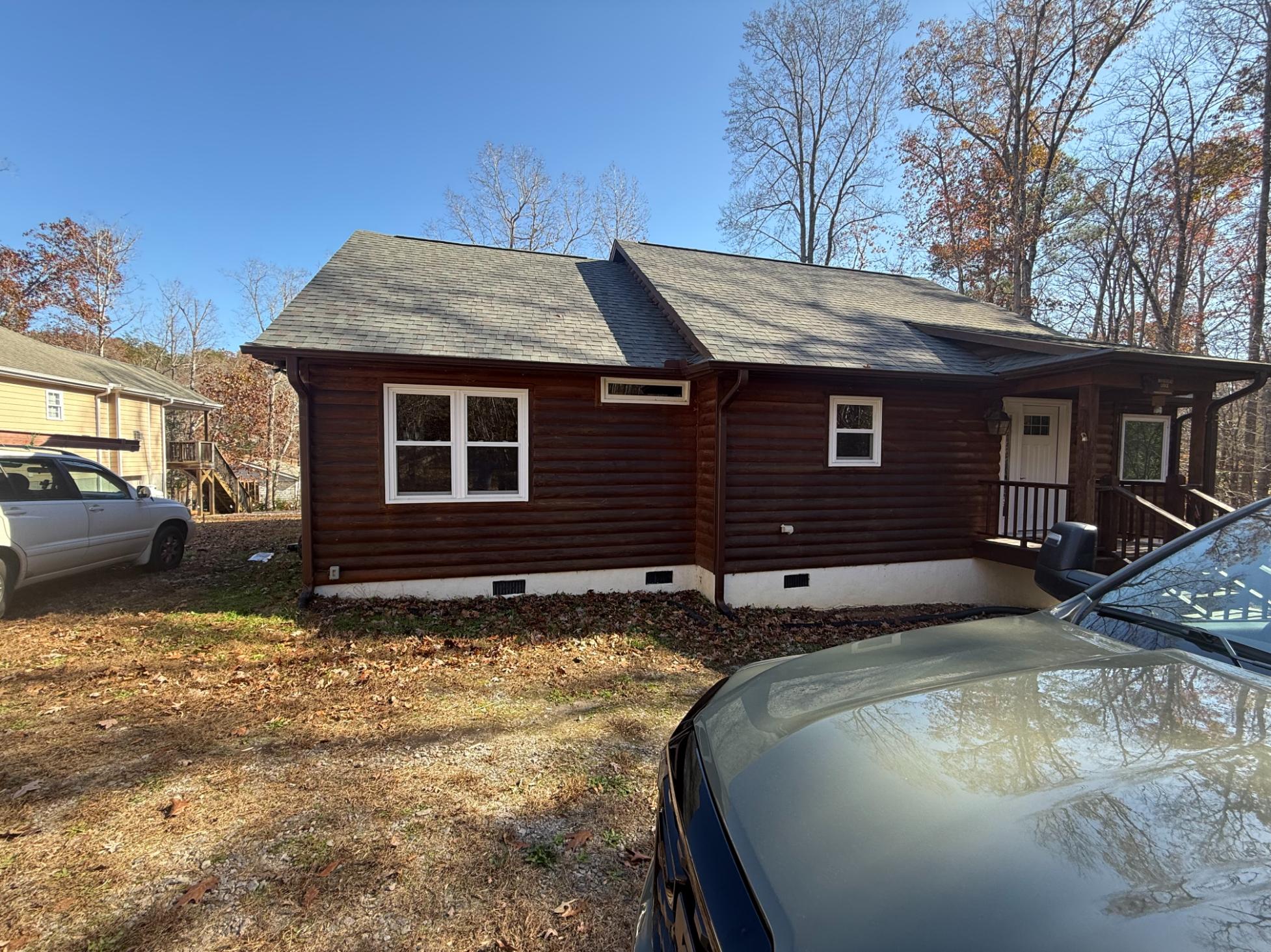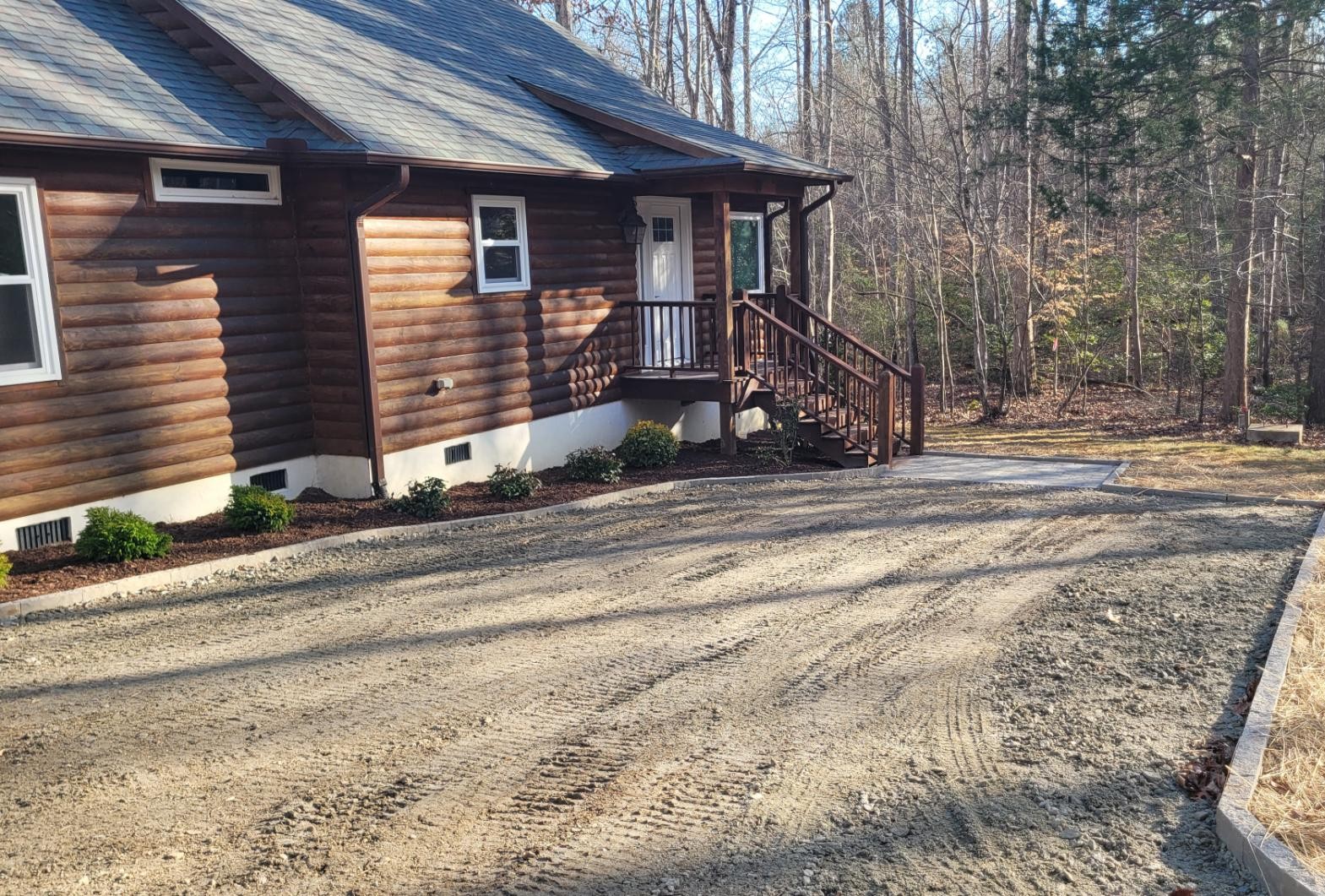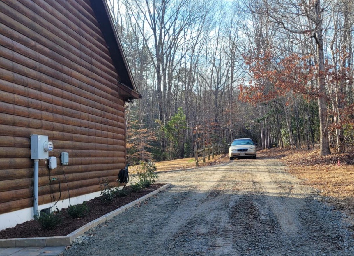 First, we needed to re-establish the driveway and parking area. To do so, we hauled in some 20 tons of crush and run gravel to create a 15′ wide by 66′ long gravel parking area/driveway.