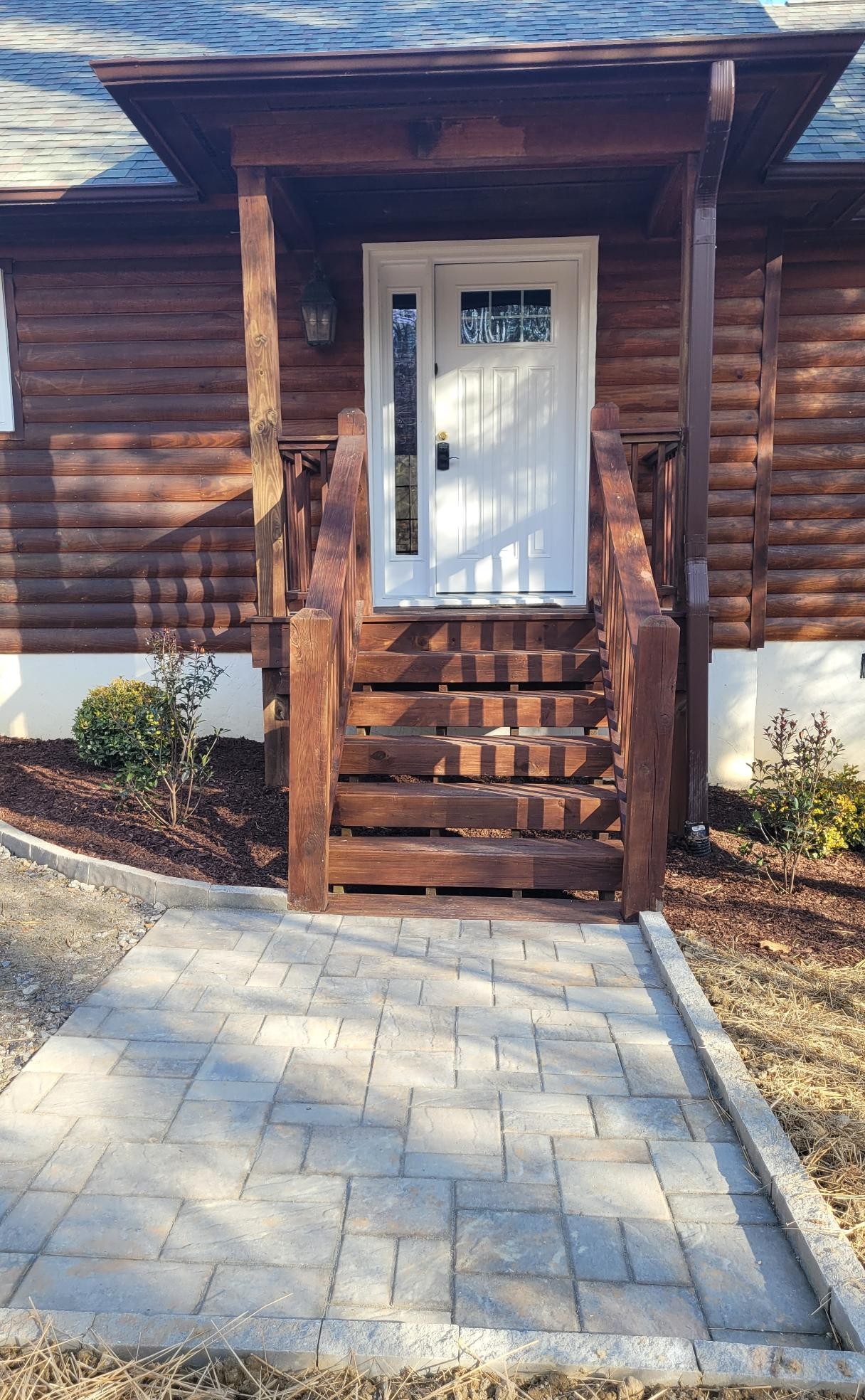 And the finishing touch, a 6′ x 8′ Techo-Bloc Champlain Grey Slate Eva paver landing at the base of the front porch steps.
