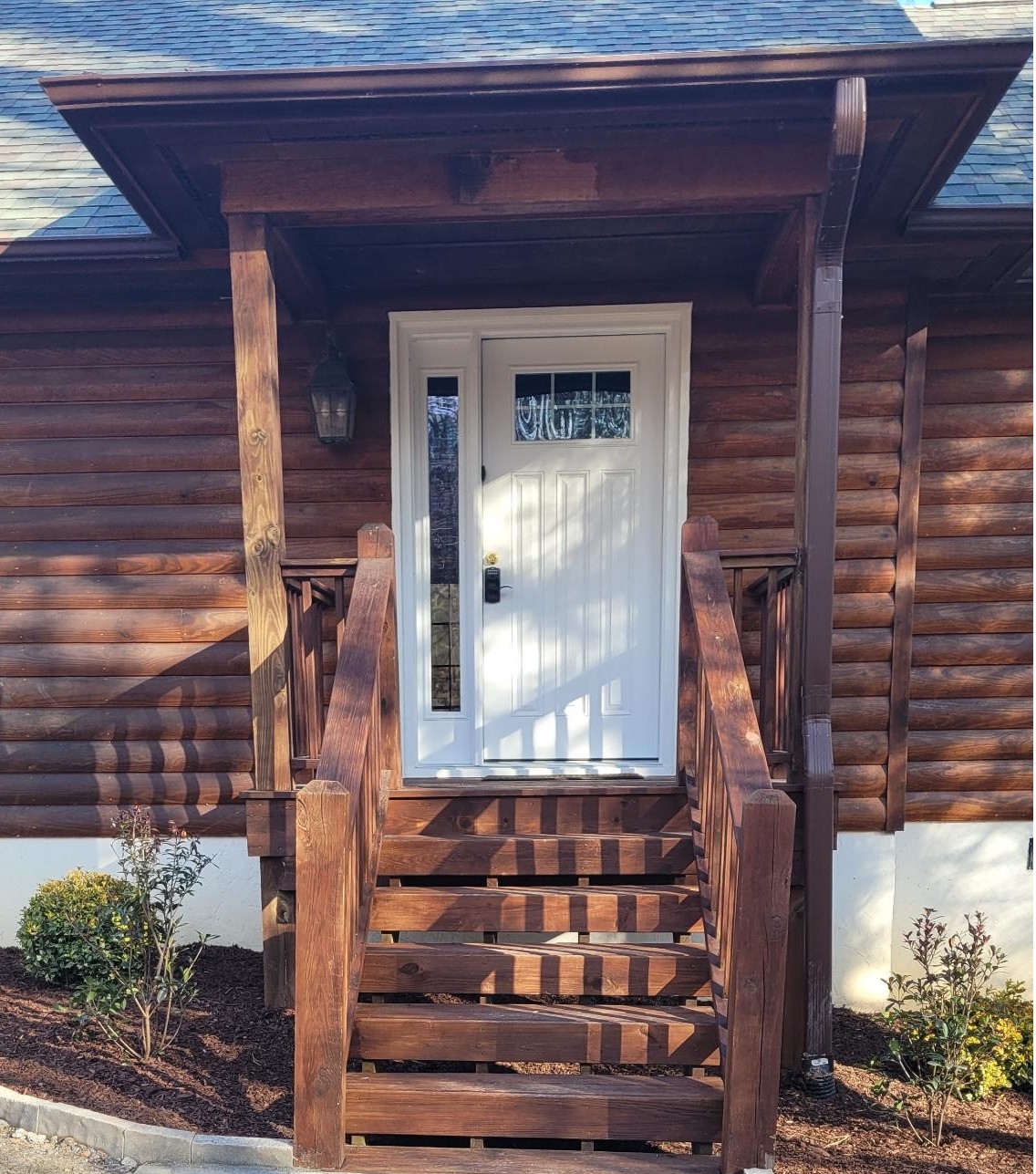 So, we installed new foundation plantings. Along the front is a Goshiki Osmanthus and Dwarf Cryptomeria. Two Goshiki Osmanthus and Cleyera Japonica guard the left and right sides of the front porch. And a Camellia Sasanqua and Duke Garden Yews complete the side foundation plantings.