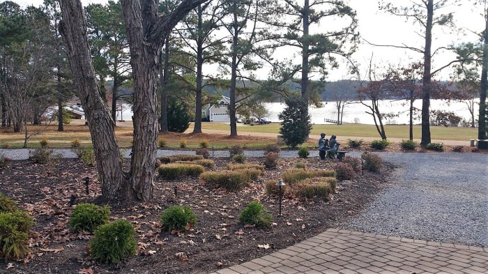 As promised, here are finished photos of major work for this customer involving the tearing up of old plant beds, and the installation of new plants and shrubs, night lighting, and a golf cart path to the boathouse. Click on any photo to get a closer look.