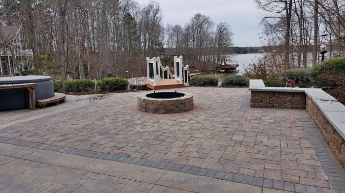 What is better than a lakeside patio? How about two lakeside patios! That's what our guys just completed. They built two River Street Lafitt 3 piece multi-color patios, one 20' in diameter and the other 18', and connected them with two tan natural stone steps 10' wide. On the lower patio, our crew installed a … Continue reading Twice the Fun