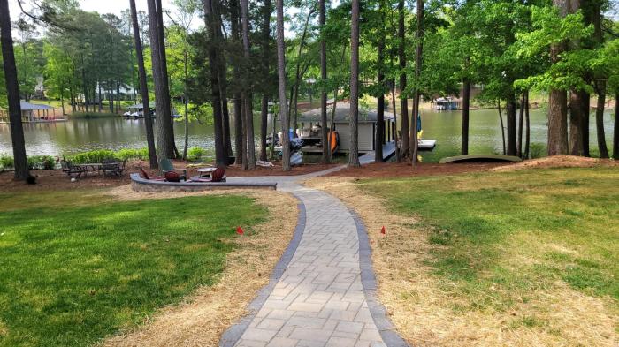 Just finished! This is another targeted upgrade to an existing landscape. It is a Lake access walkway with an adjoining patio fire pit. Before and after: Owens The walkway is a 100' long Eva Champlain Grey sidewalk and Onyx Black accent border, connecting a matching 6' x 8' paver landing with a dark grey slab … Continue reading Lake Walkway & Patio Fire PIt