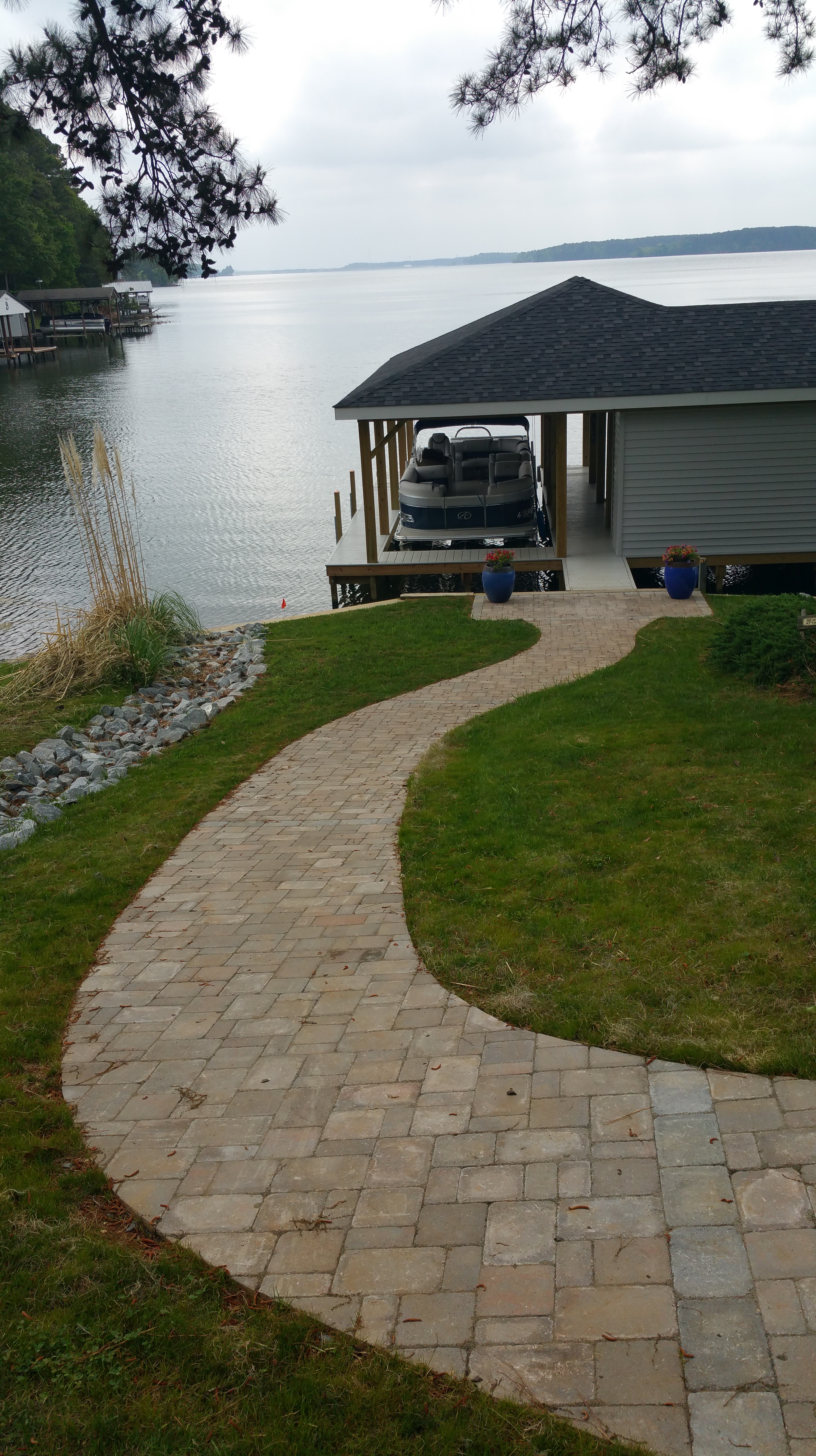 Longer than a football field, this impressive River Street Laffit paver walkway stretches from the driveway, around the house, to the boathouse. Lincoln Creek stone slab steps augment this walkway at three places along the way.